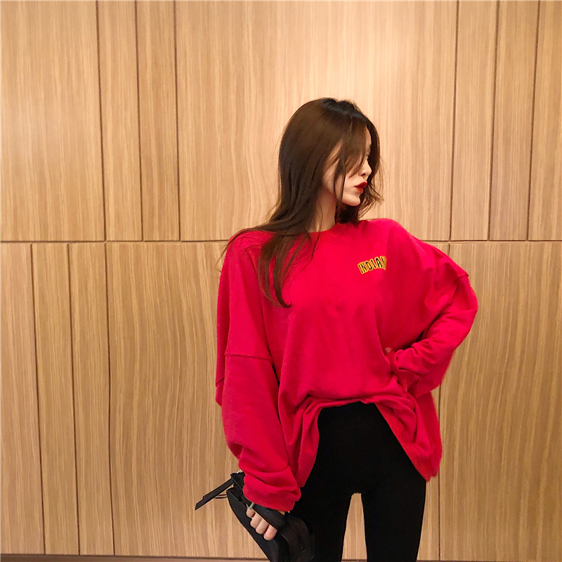 時尚百搭遮臀繡花字母套頭衛衣2018新款女長袖韓版寬松顯瘦上衣潮