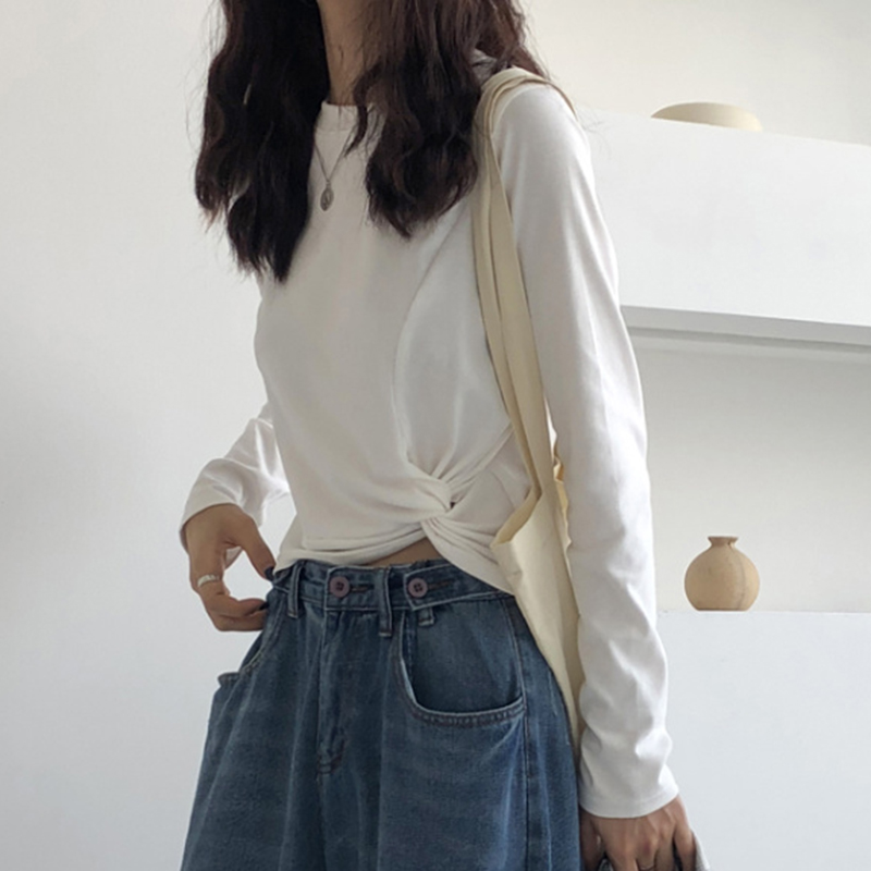 時尚短上衣秋裝女2018新款韓版修身圓領打底衫學生打結長袖黑T恤