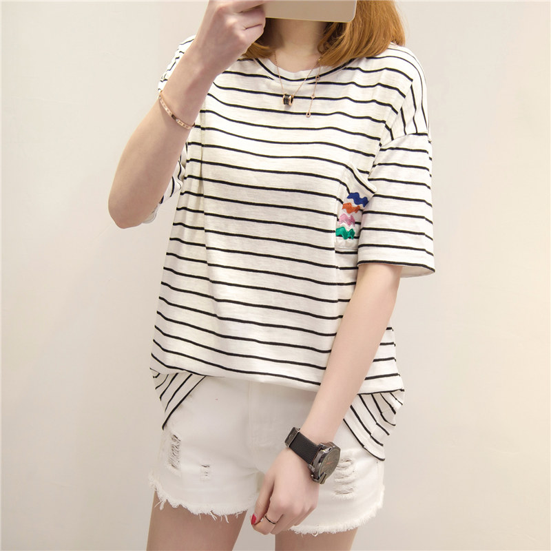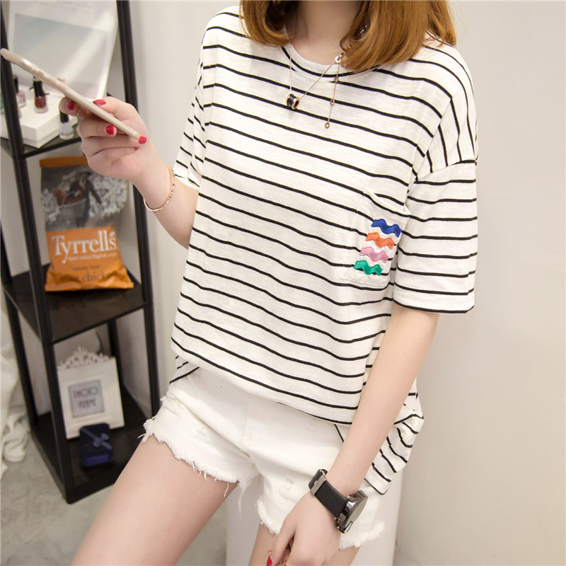 / 衣服女春裝新款潮條紋短袖t恤女寬松上衣韓版學生百搭打底衫