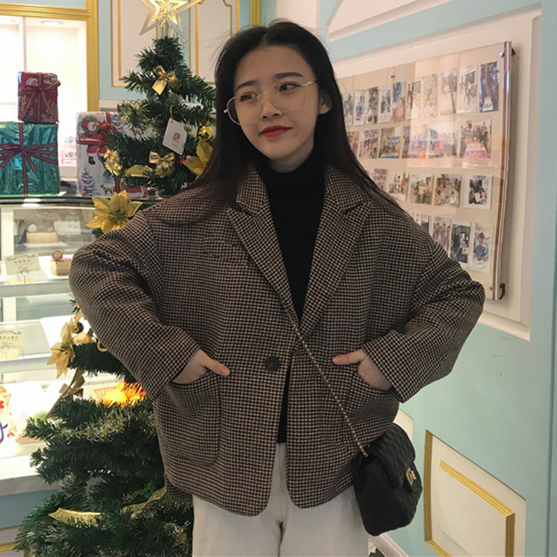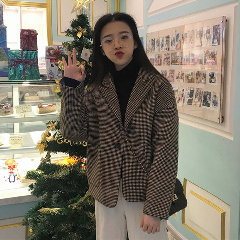 2018流行毛呢外套女秋冬裝新款復古風格子小西裝學生寬松呢子開衫