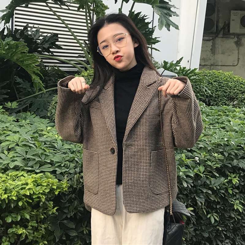 / 2018流行毛呢外套女秋冬裝新款復古風格子小西裝學生寬松呢子開衫