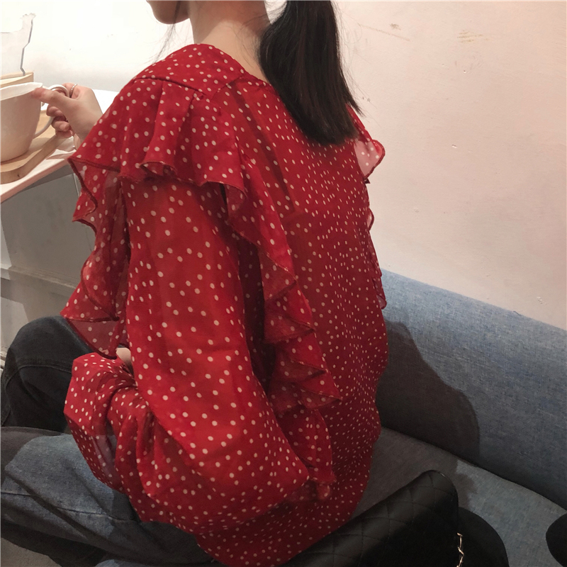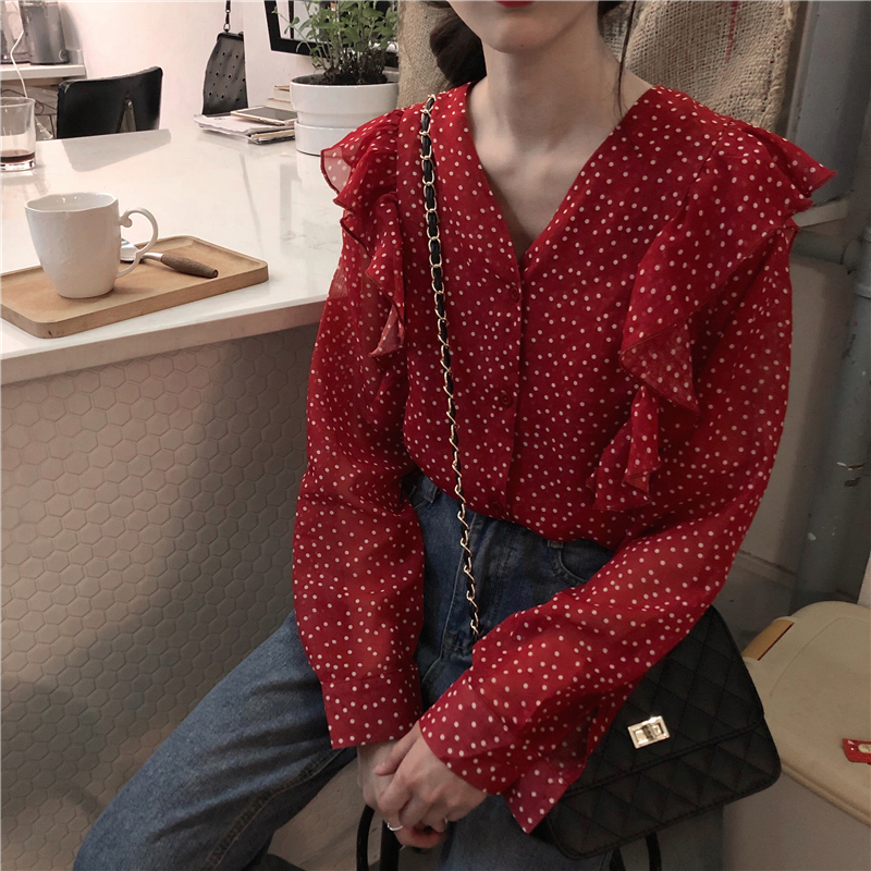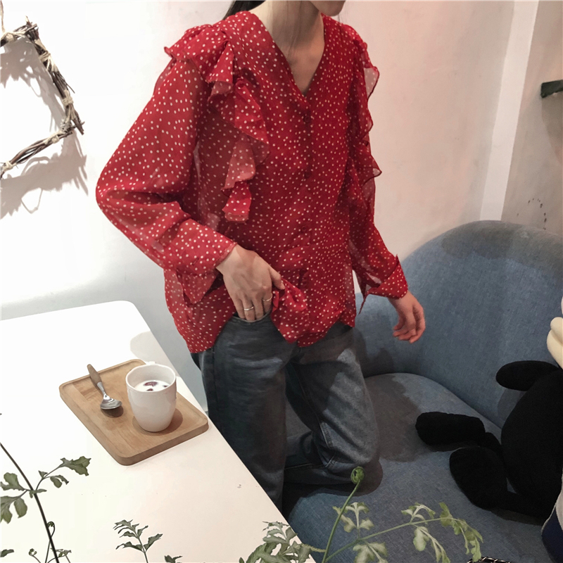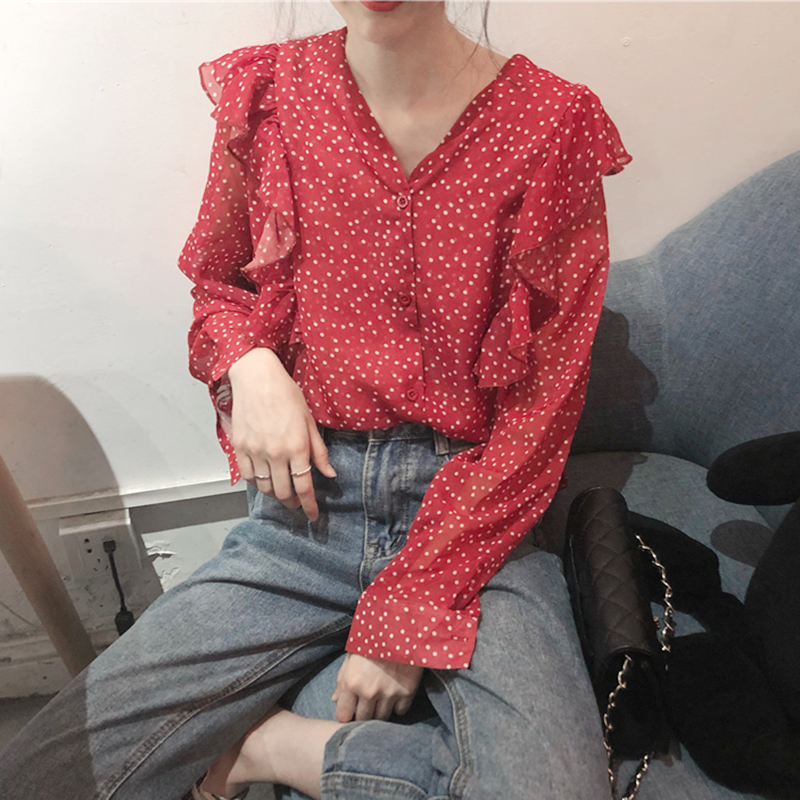 / 早秋女裝韓版氣質波點荷葉邊長袖寬松顯瘦V領百搭雪紡衫襯衫上衣