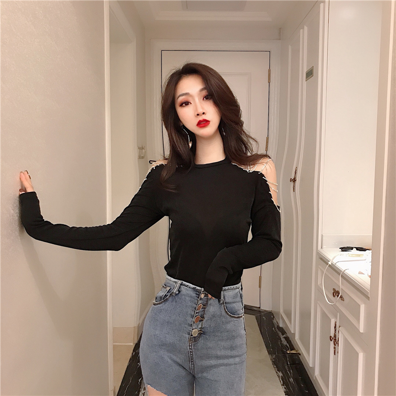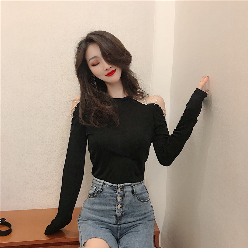 / 秋季新款chic港味復古小性感修身顯瘦氣質碎磚吊鏈露肩打底衫上衣