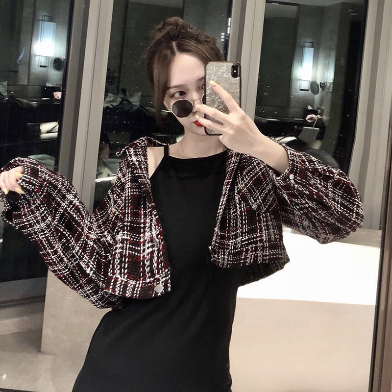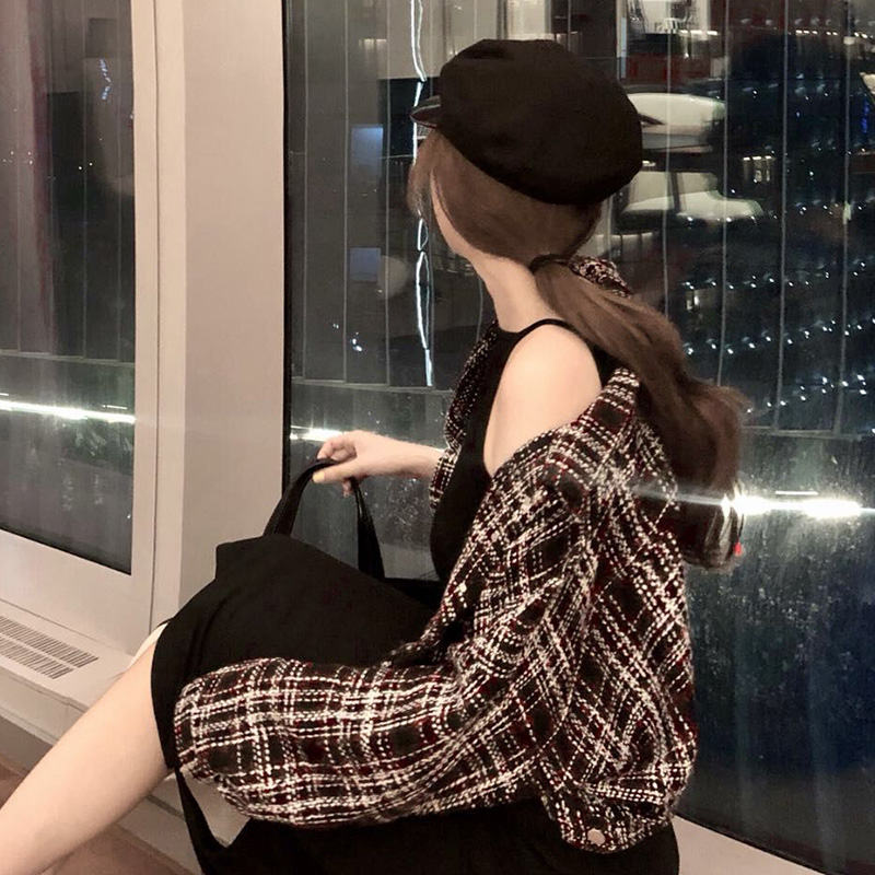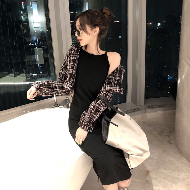 外套配裙子兩件套裝秋季2018新款復古短款呢子外套時尚開叉吊帶裙