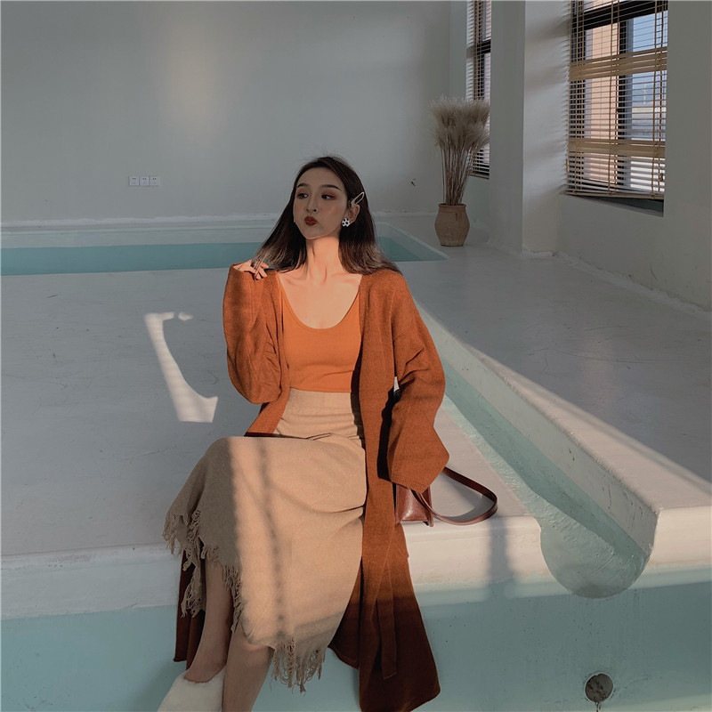 chic早秋毛衣慵懶風針織開衫復古氣質長款開叉針織上衣腰帶外套潮