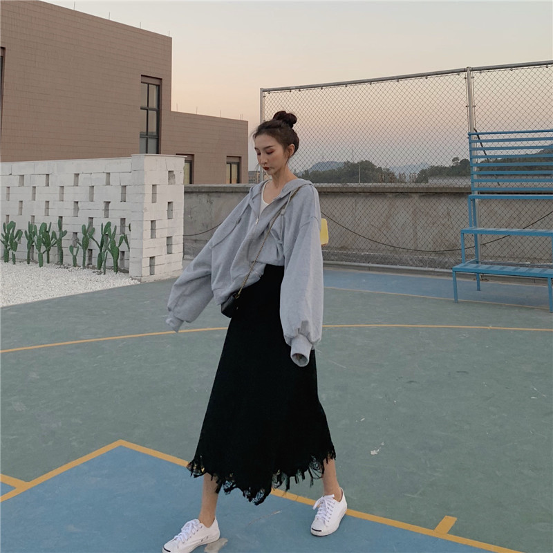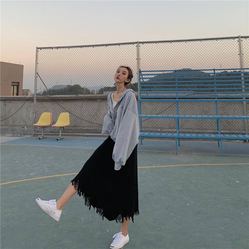 chic早秋裙子長裙女慵懶風韓版百搭寬松連帽系帶過膝長袖連衣裙潮