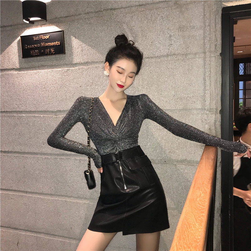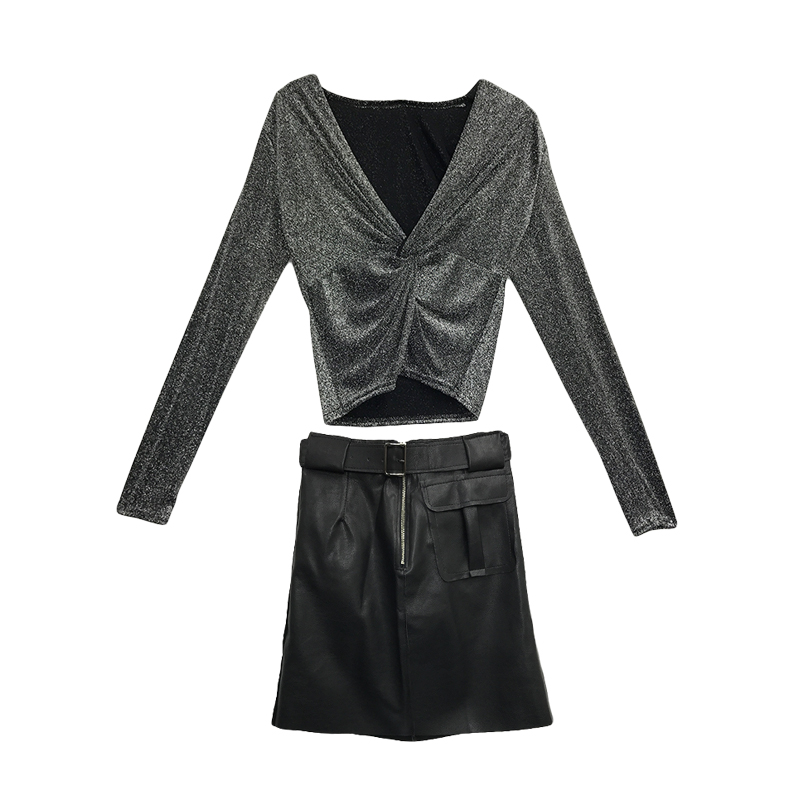 秋冬港味V領褶皺收腰顯瘦百搭T恤+復古高腰半身皮裙女套裝分開拍