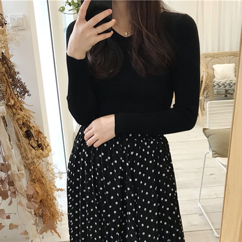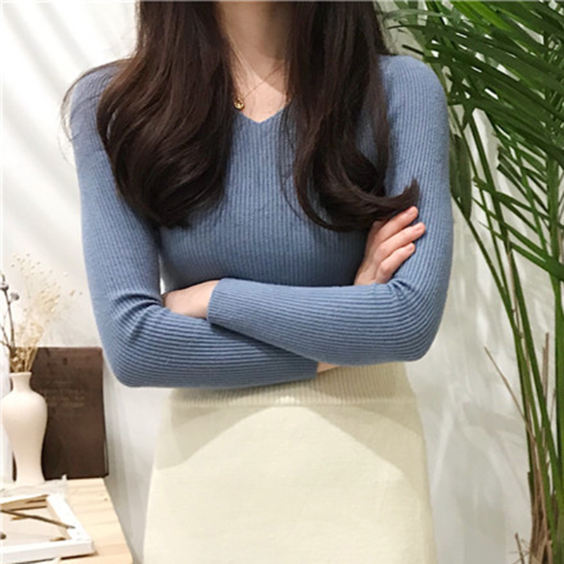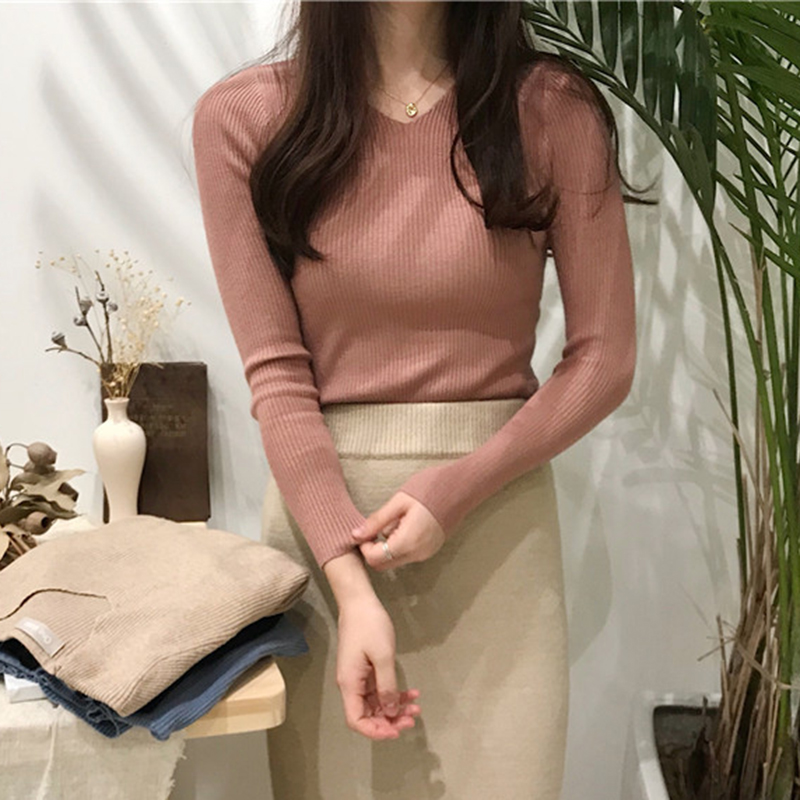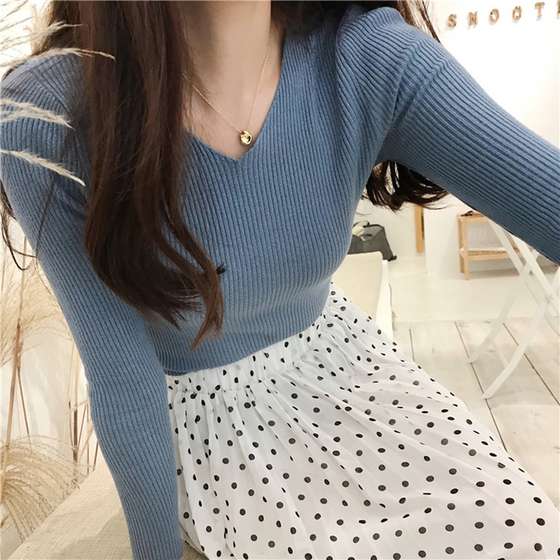 港味復古針織衫秋裝女2018新款chic風修身打底衫氣質長袖V領上衣