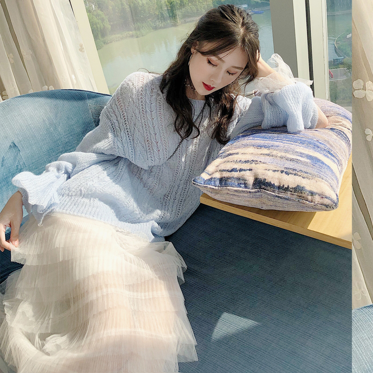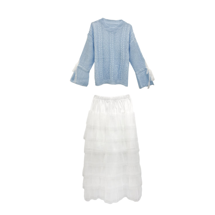 慵懶風拼接網紗系帶長袖圓領針織衫網紅毛衣+仙女氣質網紗蛋糕裙