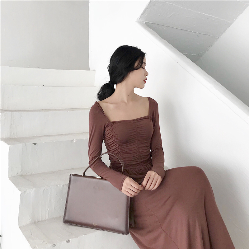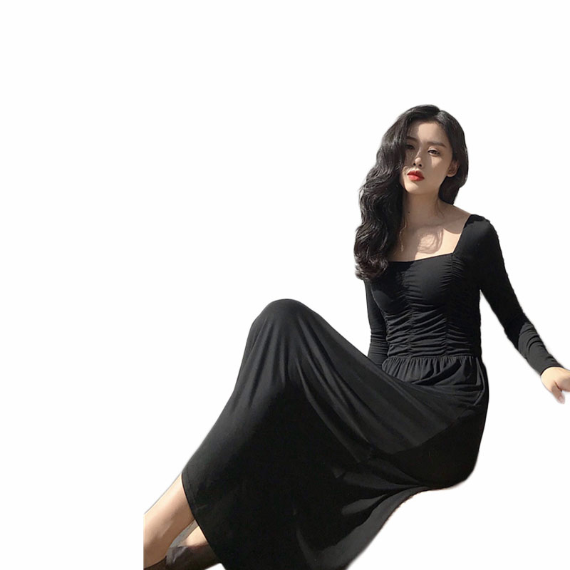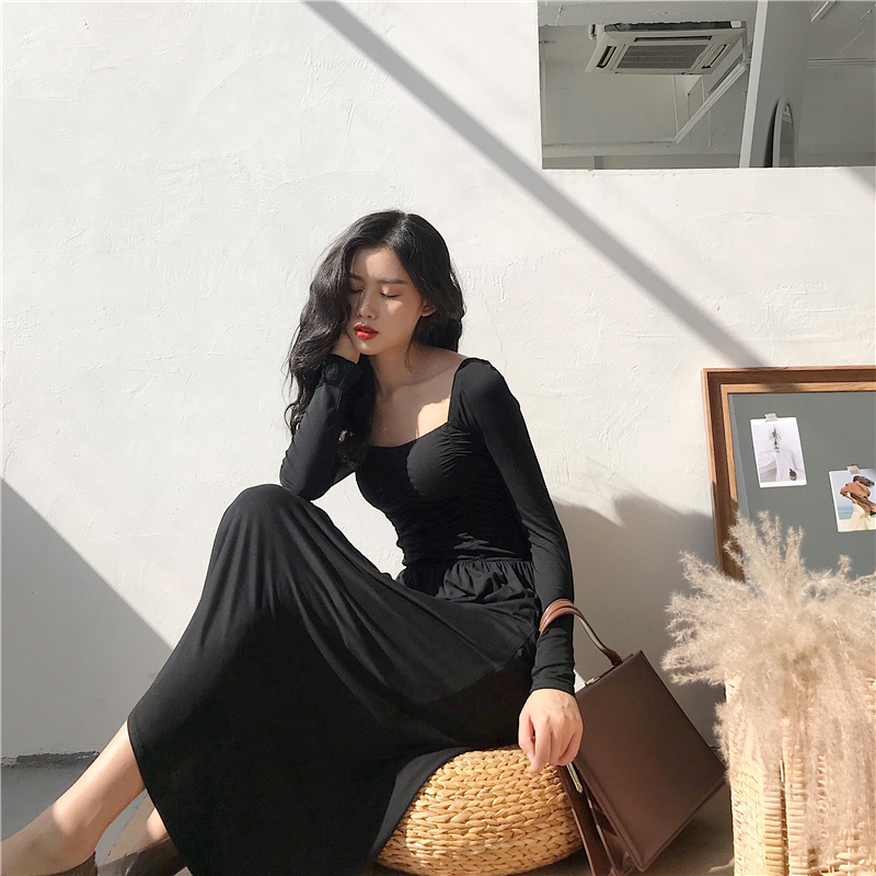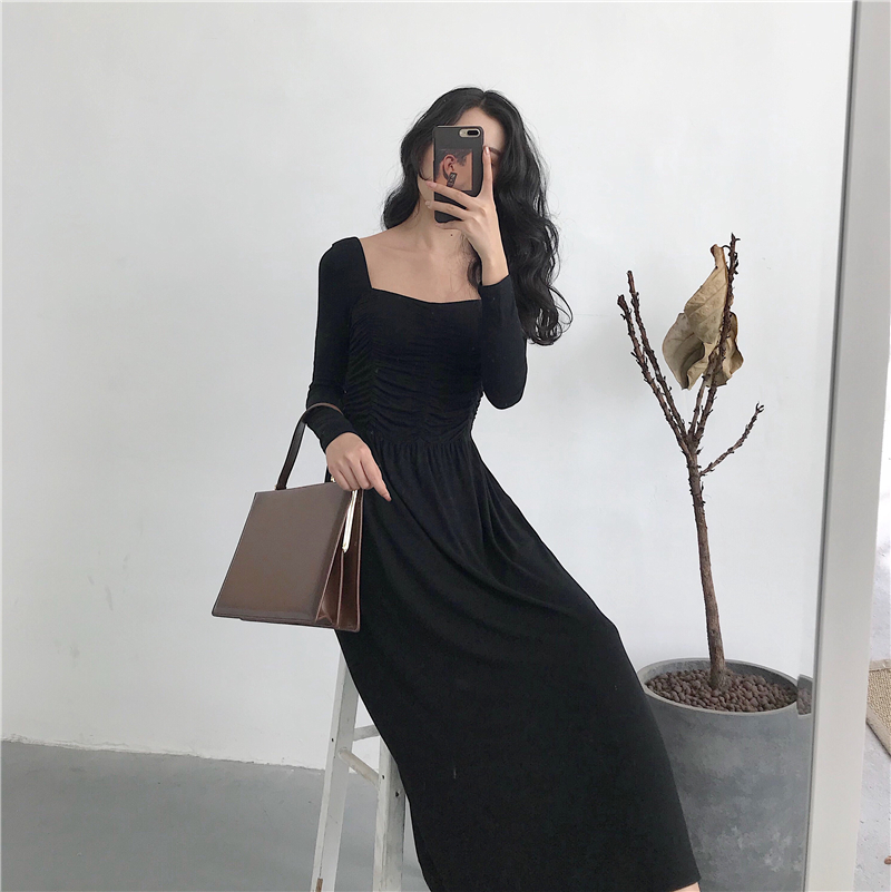 2018秋季新款韓版漏鎖骨長袖顯瘦連衣裙女復古氣質溫柔風A字裙子