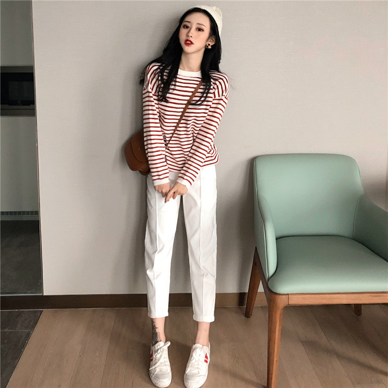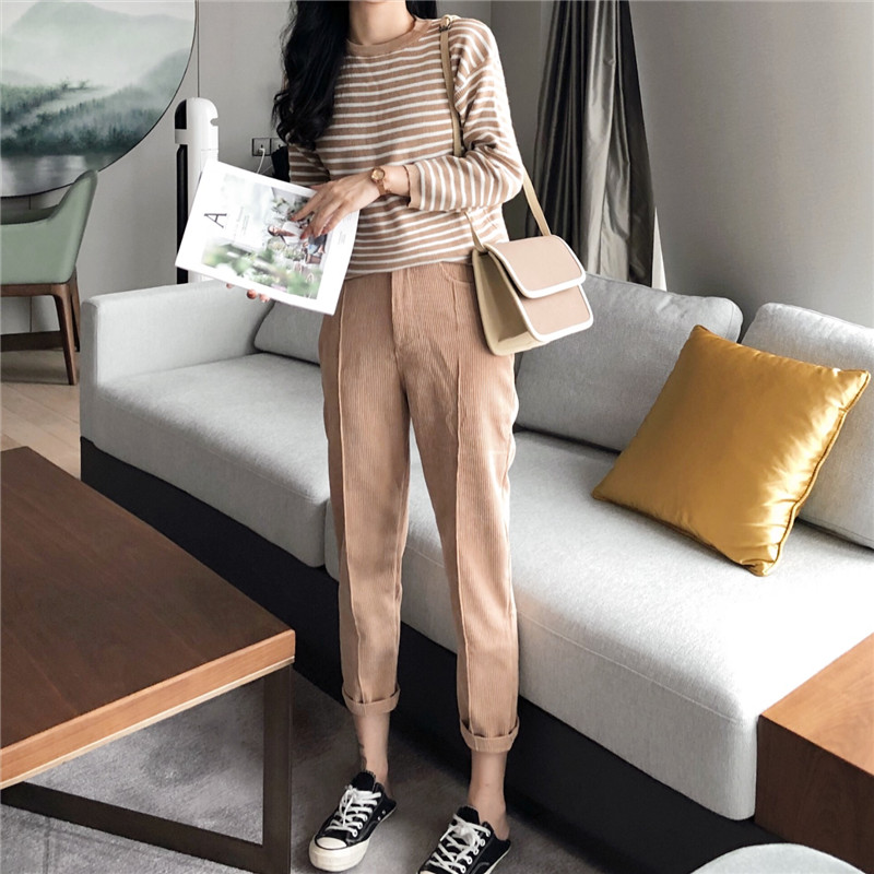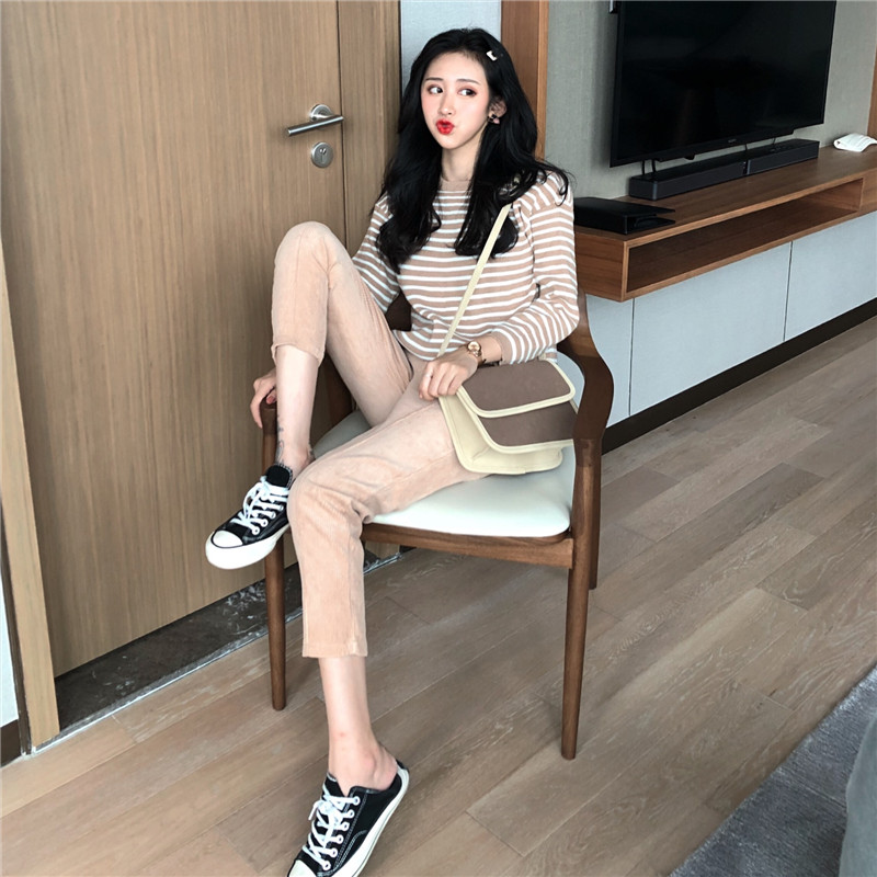 / 秋冬新款復古百搭撞色條紋針織衫+復古韓國chic風燈芯絨休閑褲女