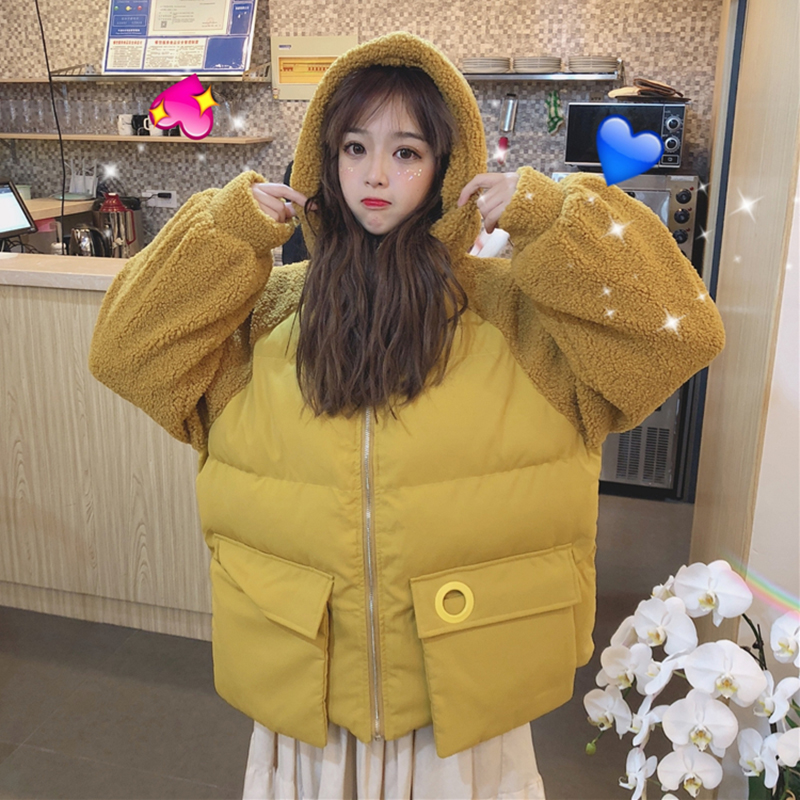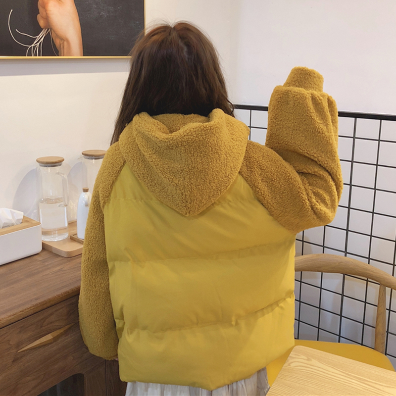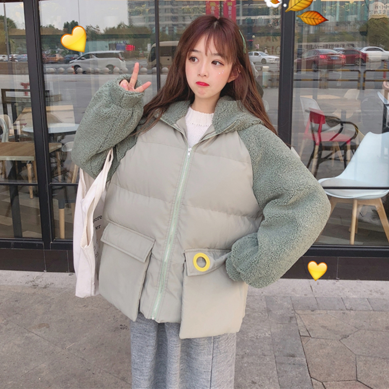 學院風拼接羊羔毛棉衣女秋冬裝2018新款韓版時尚寬松加厚連帽外套