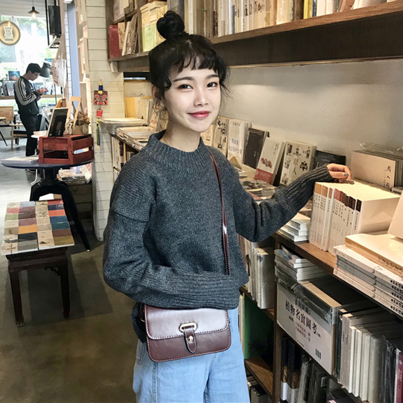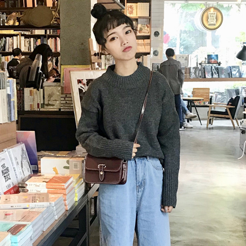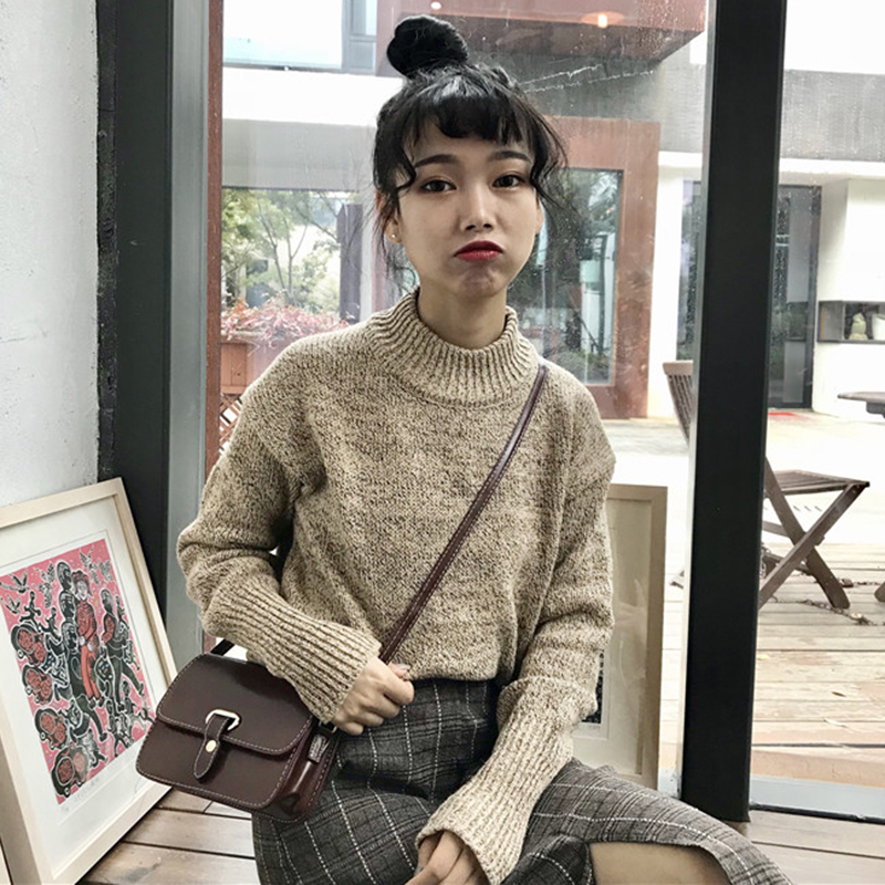 復古風小高領套頭針織衫秋裝女2018新款學生休閑毛衣寬松長袖上衣