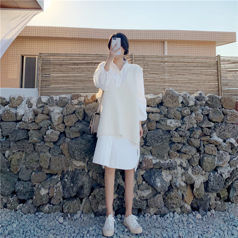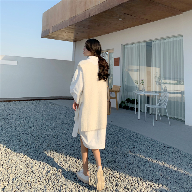 / 秋裝女2018新款厚實基礎長款襯衫+慵懶寬松V領毛衣背心馬甲兩件套