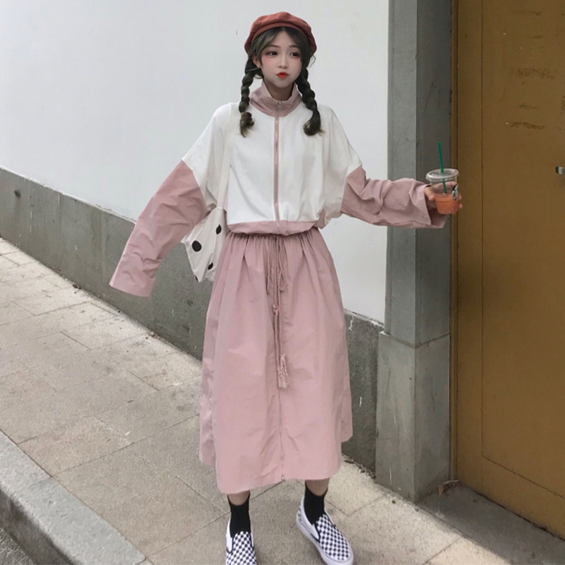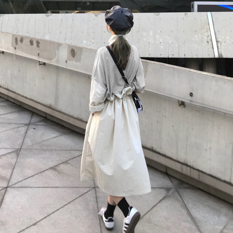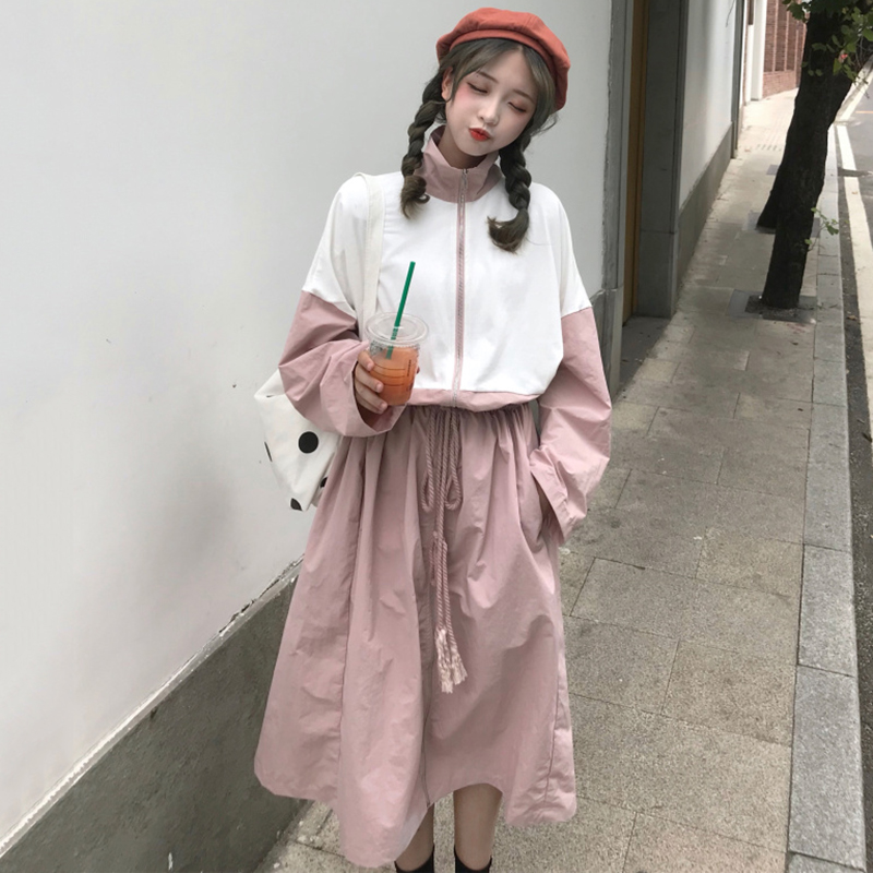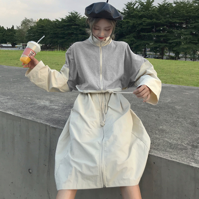 / 秋季女裝韓版拼色拉鏈立領休閑長袖連衣裙寬松收腰顯瘦學生中長裙