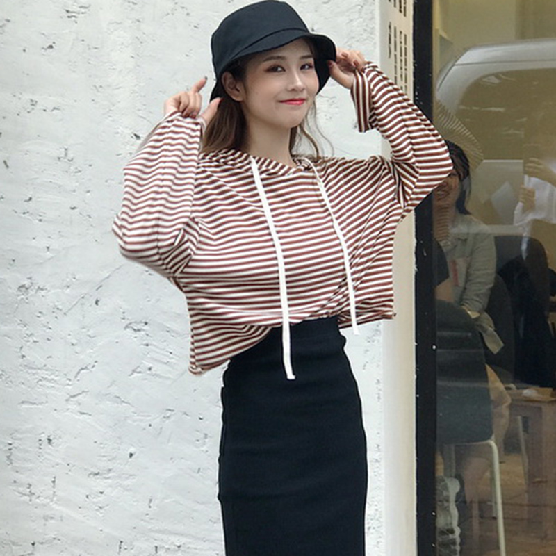 秋裝衛衣女2018新款韓版新款寬松顯瘦慵懶休閑橫條紋連帽長袖上衣