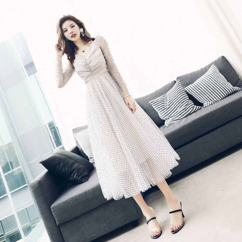 淑女波點性感連衣裙女夏冷淡風2018新款收腰長袖小清新收腰裙子