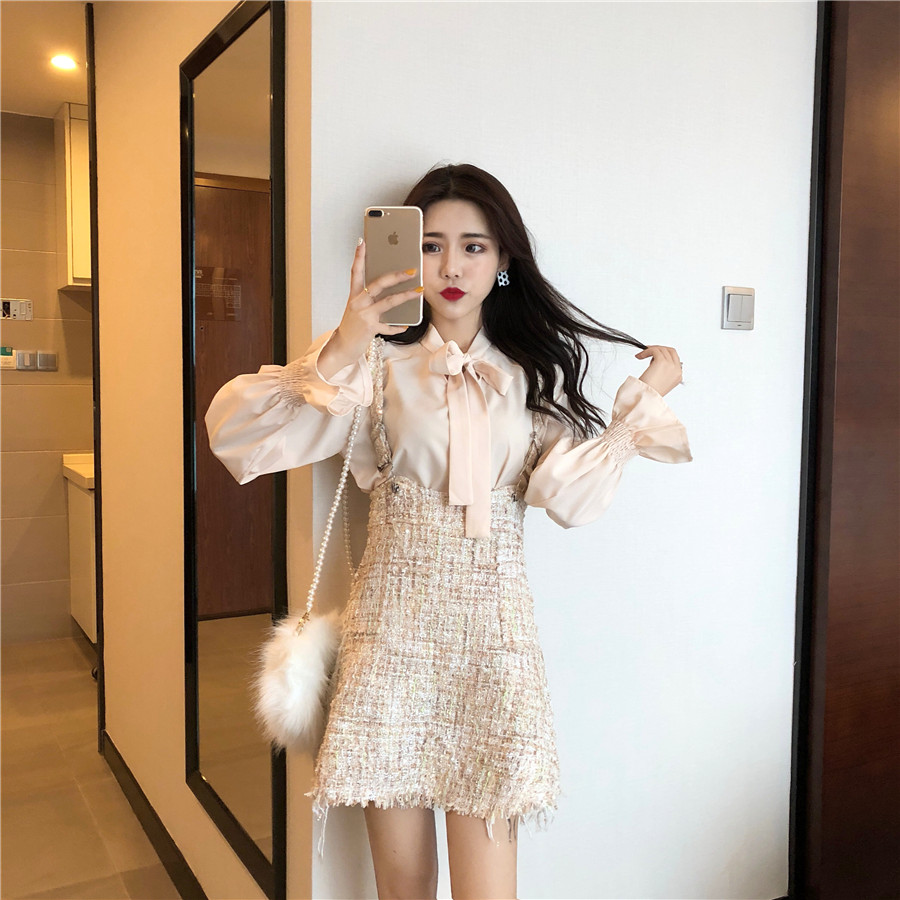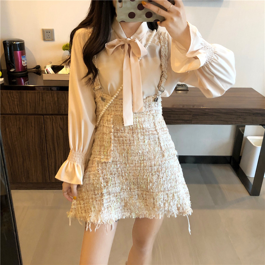 / 網紅同款秋季套裝女時尚套裝小香風仙女長袖襯衫+百搭背帶包臀裙