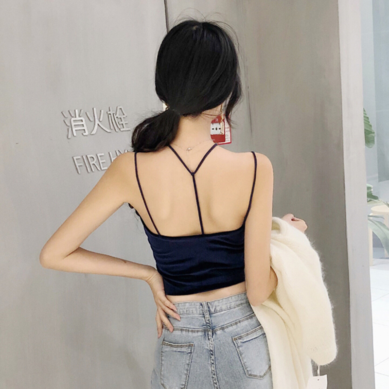 復古絲絨背心秋裝女2018新款純色露背掛脖吊帶胸前交叉氣質短上衣