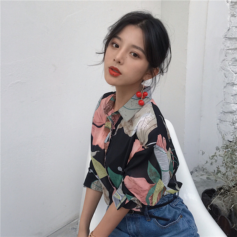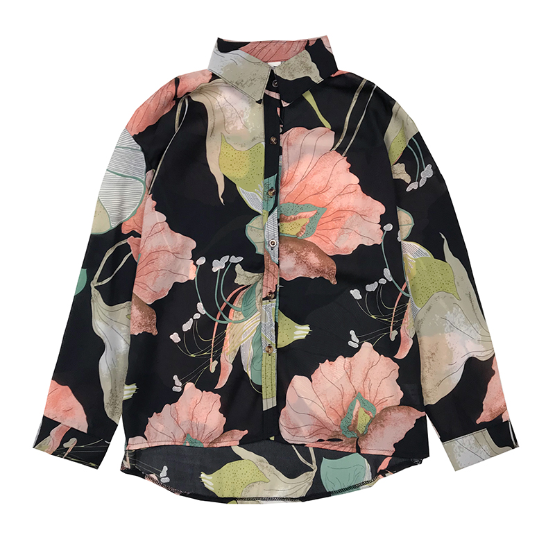 / 早春新款女裝港味復古寬松顯瘦大花氣質翻領學生排扣長袖雪紡襯衫