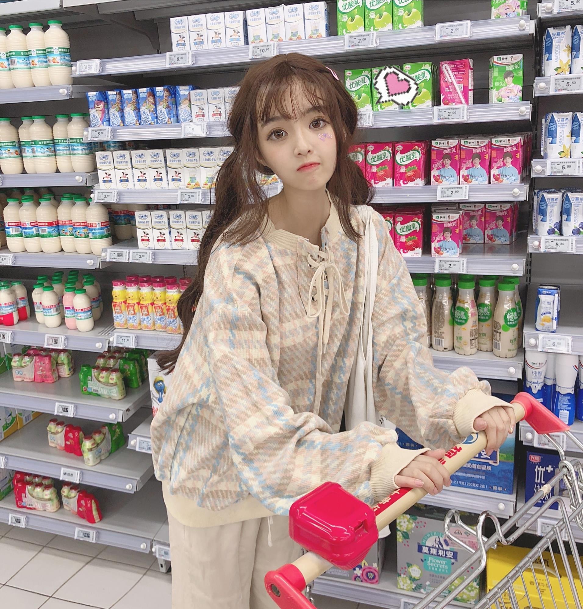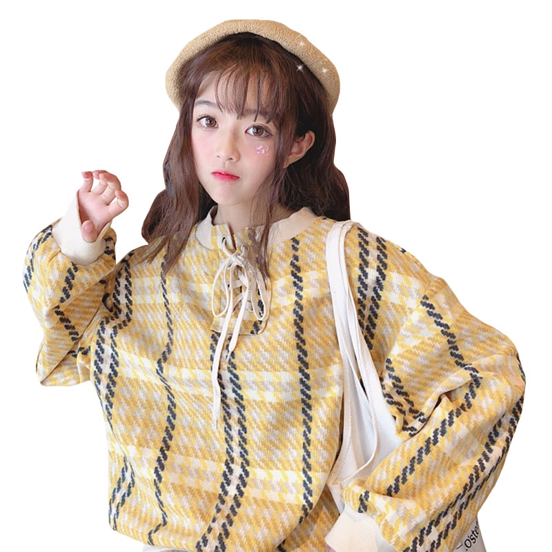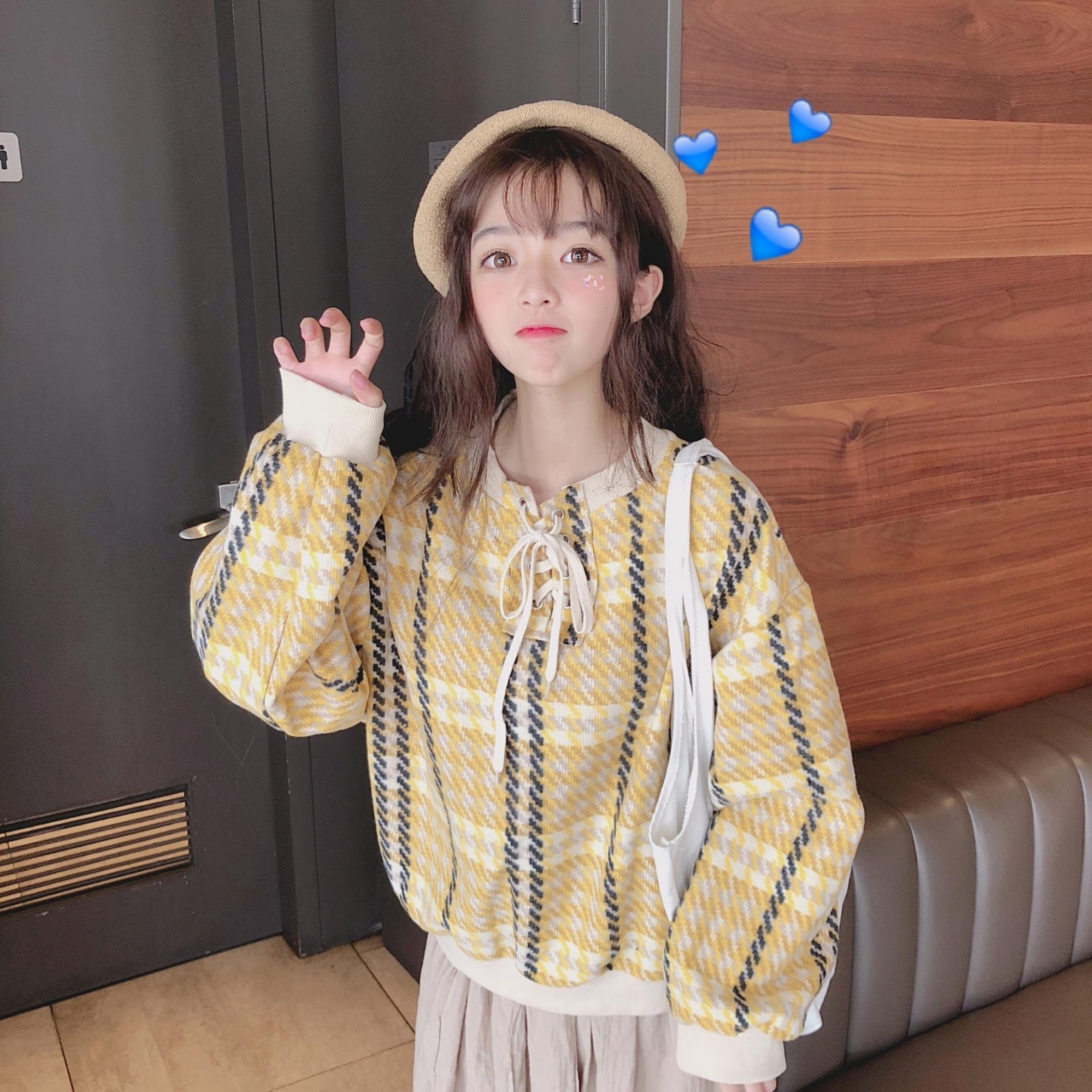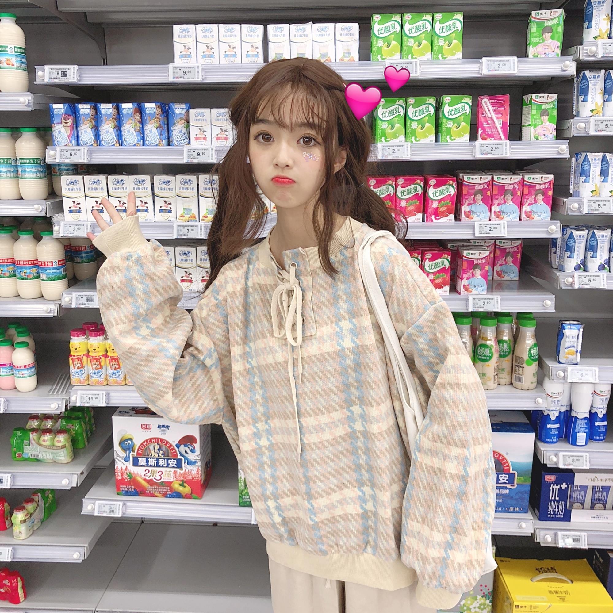 / 秋季女裝韓版學院風寬松系帶格子毛呢套頭無帽超火酷衛衣上衣外套