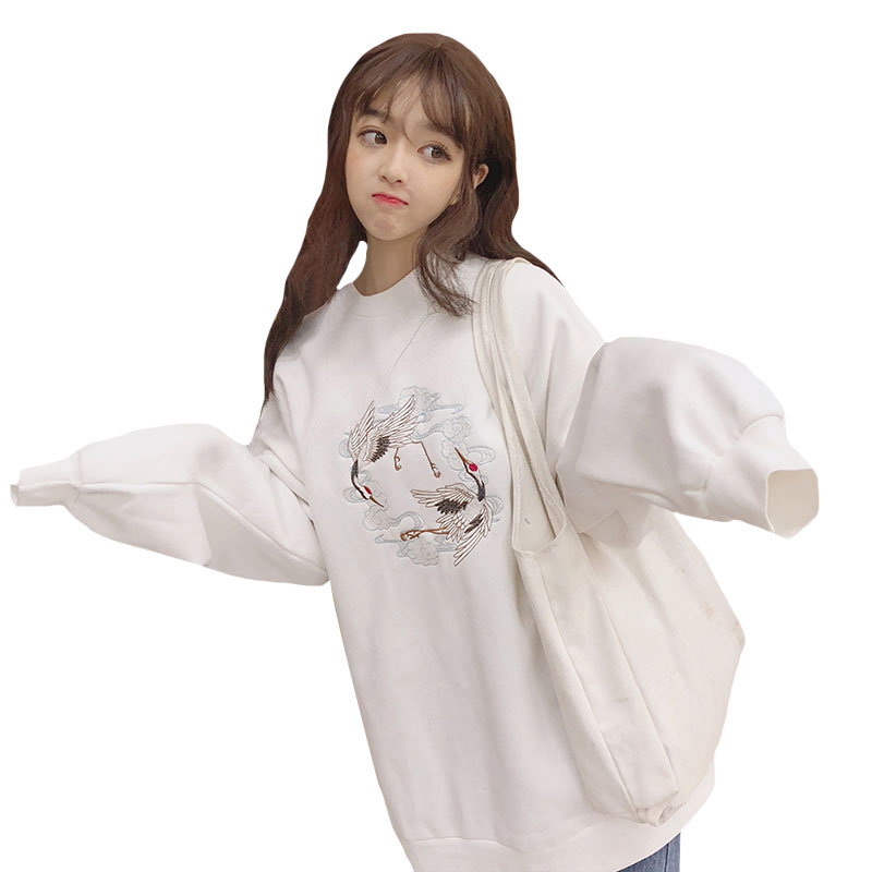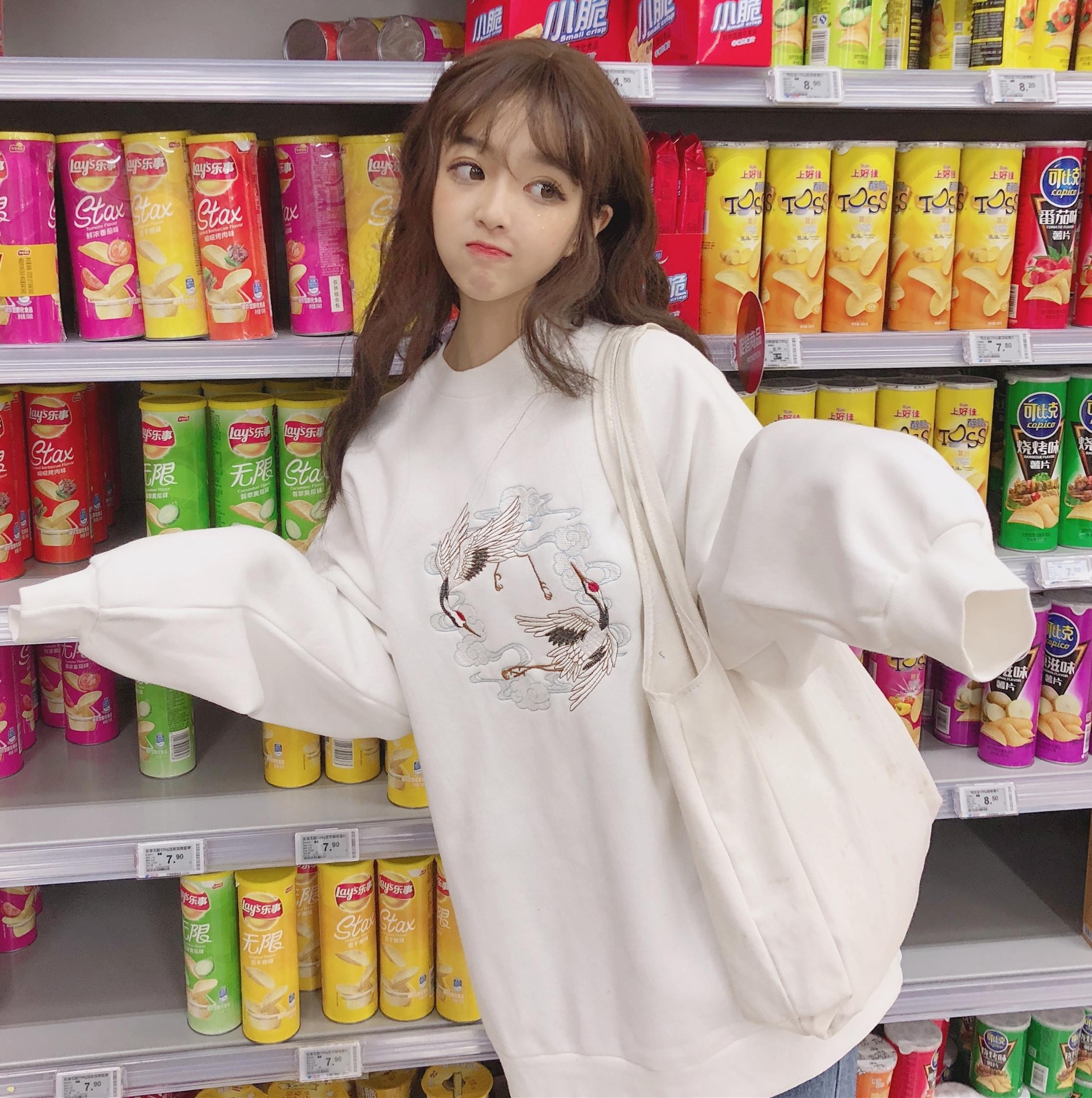 / 秋冬女裝韓版中長款原宿風寬松加絨加厚刺繡圖案超火衛衣上衣外套