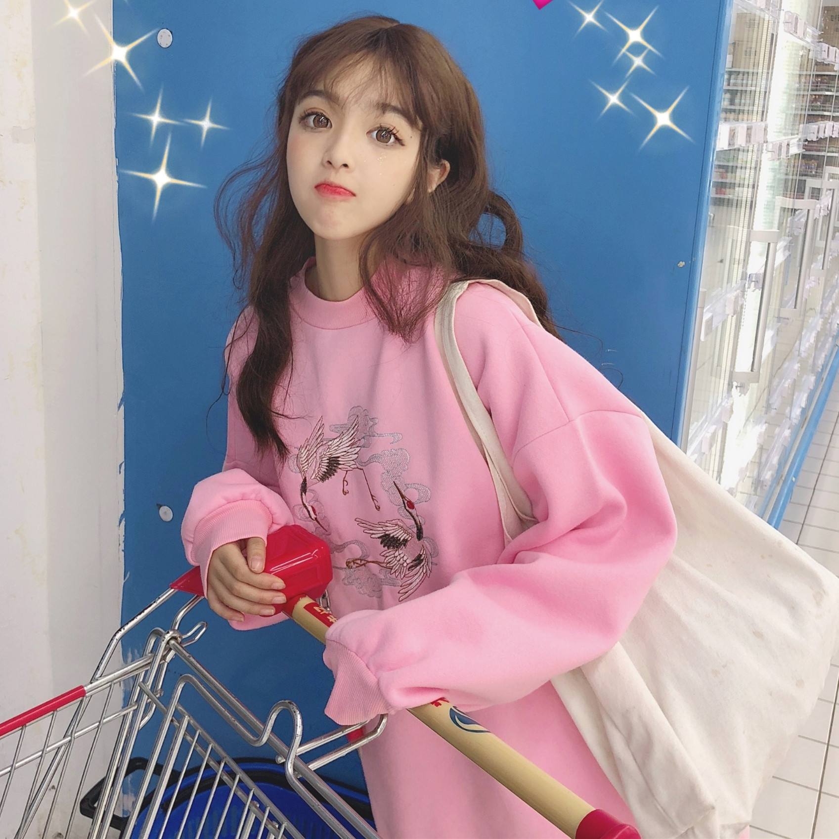 秋冬女裝韓版中長款原宿風寬松加絨加厚刺繡圖案超火衛衣上衣外套