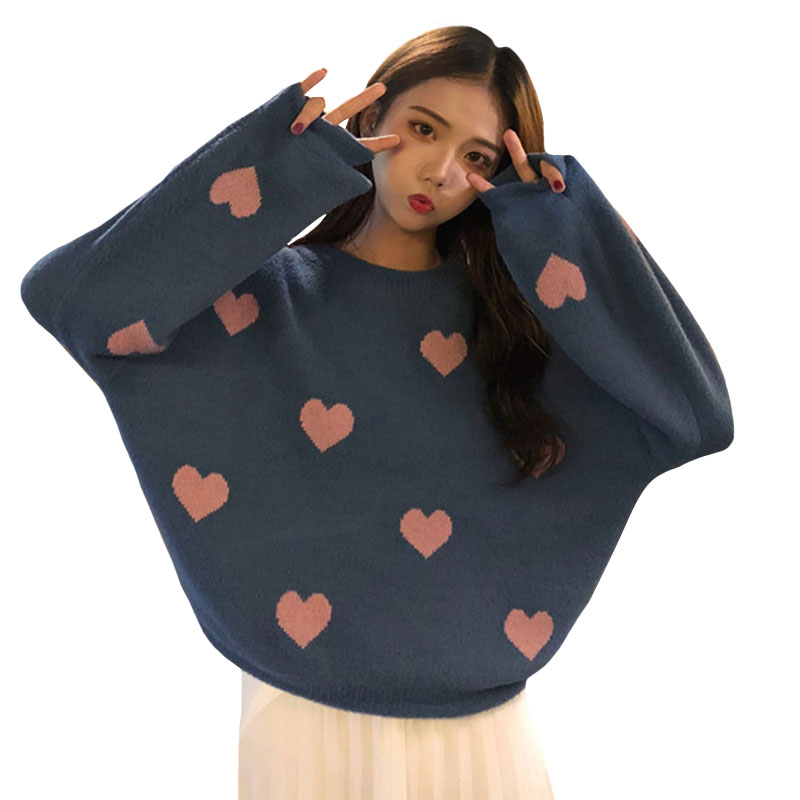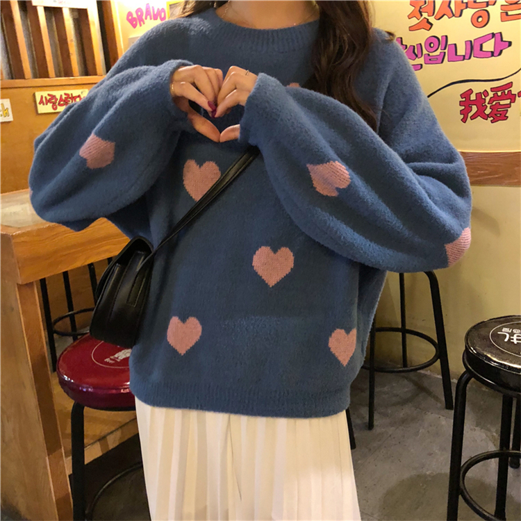 秋冬女裝韓版寬松百搭甜美慵懶風愛心網紅套頭針織衫毛衣上衣外套