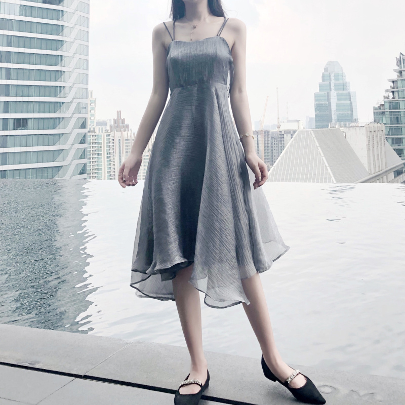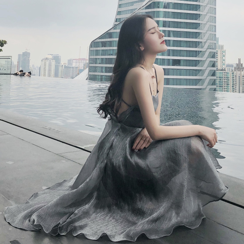 秋裝2018新款女連衣裙性感露背沙灘裙氣質海邊閃亮顯瘦吊帶禮服裙