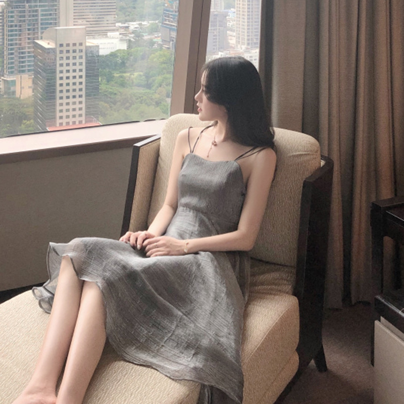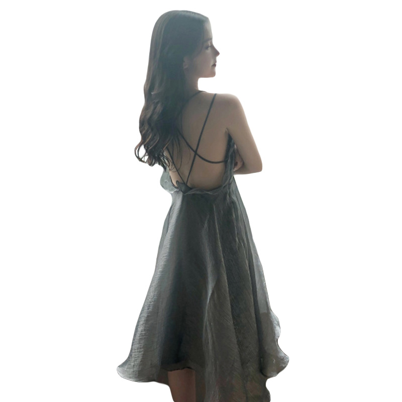 復古韓國chic風氣質性感露背交叉綁帶中長款純色連衣裙收腰吊帶裙