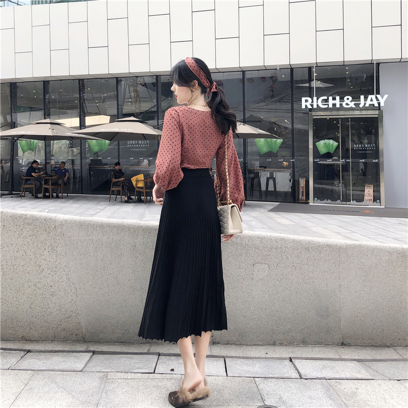 新款百搭復古波點襯衫配頭巾A字針織百褶裙港風時尚套裝兩件套女