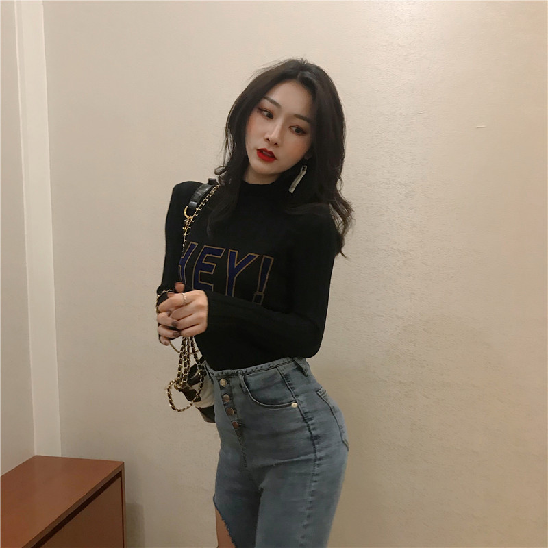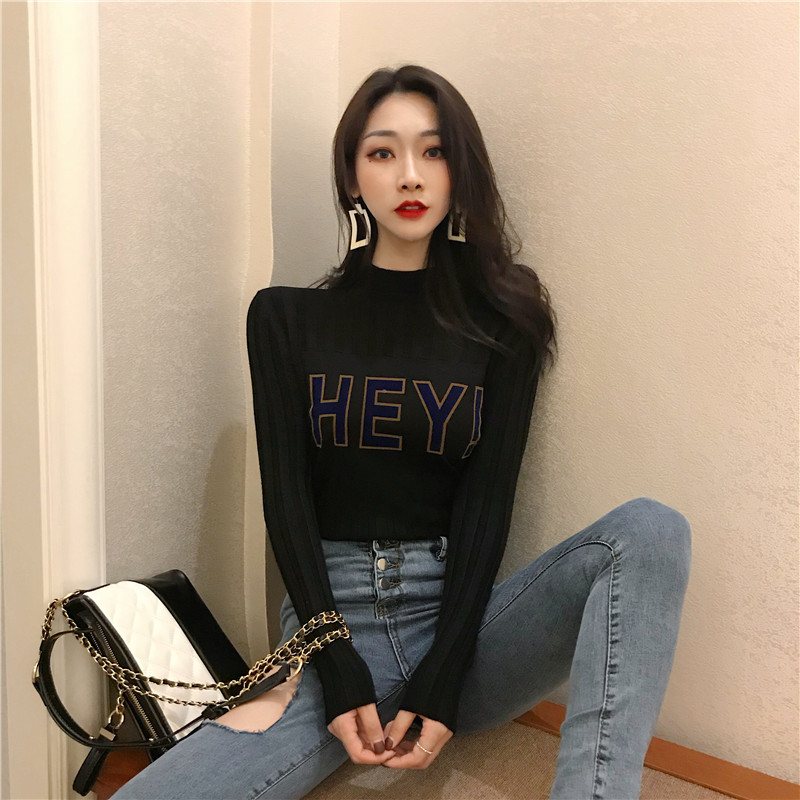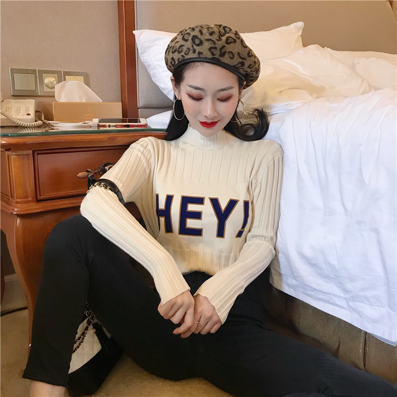 毛衣女2018新款修身半高領拼接字母加厚針織衫長袖套頭打底毛衣潮