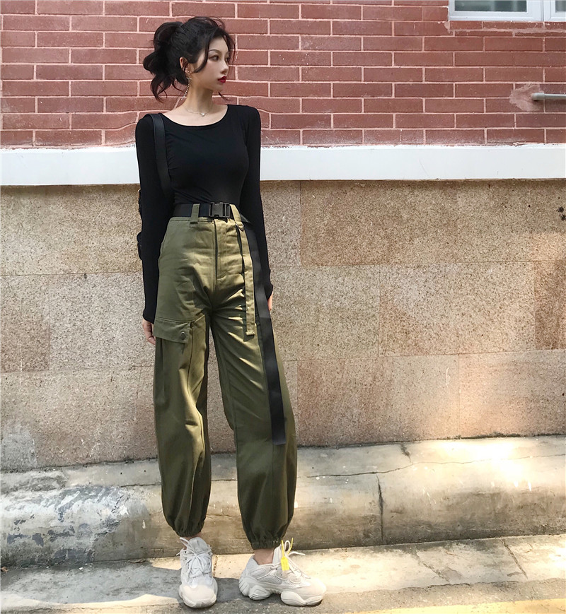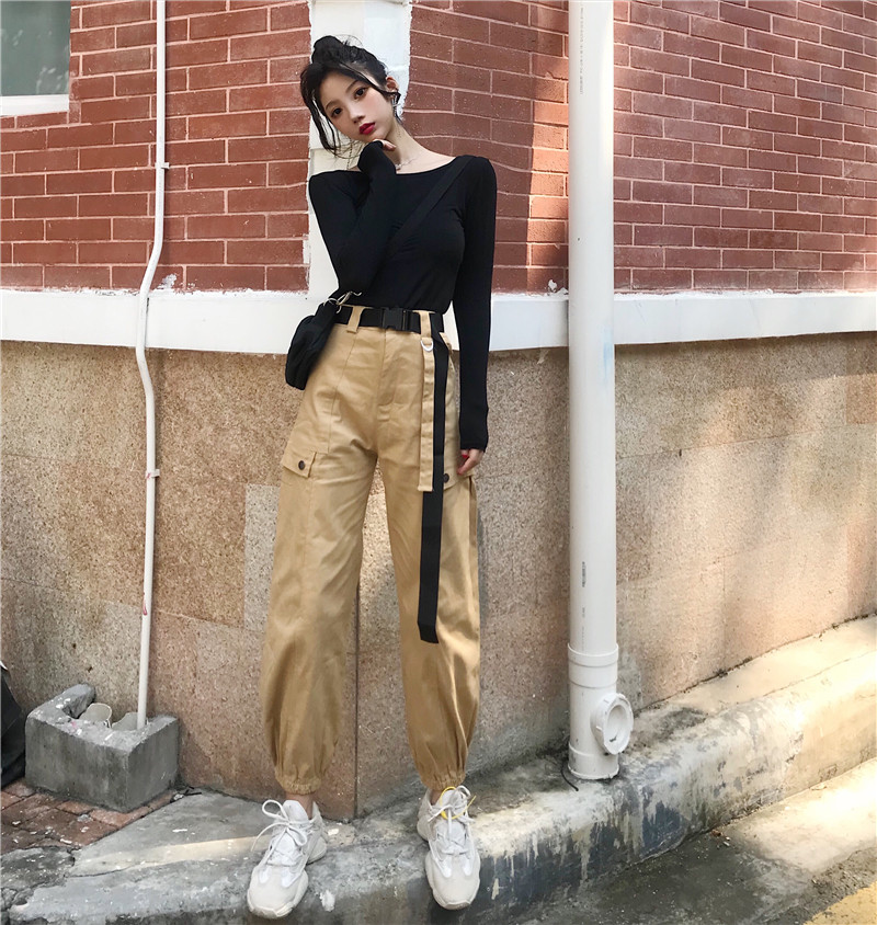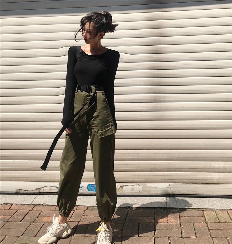 / 港味chic新款韓版時尚套裝長袖修身打底T恤高腰工裝長褲女配腰帶