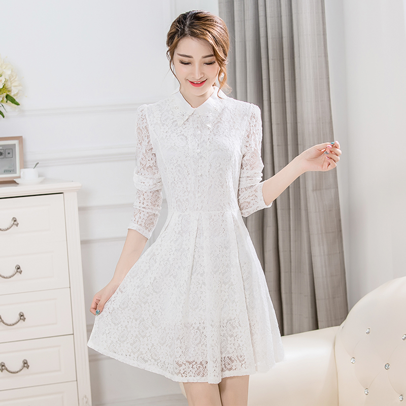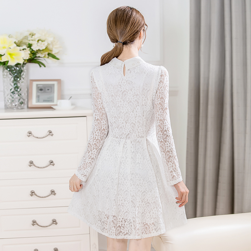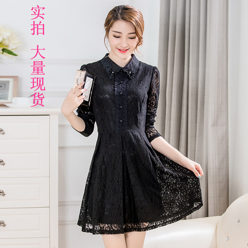 / 春季新款韓版時尚修身寬松鏤空蕾絲繡花A擺大碼打底連衣裙女