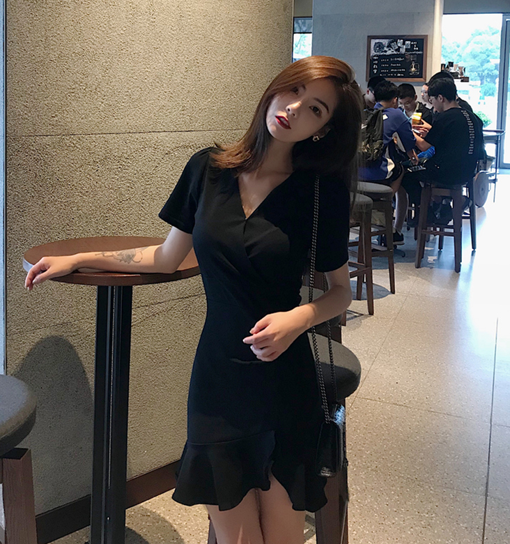 / V領高腰包臀短袖百搭chic風新款韓版開叉設計感修身顯瘦連衣裙潮