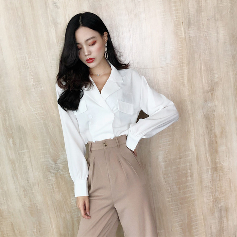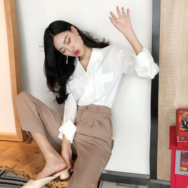 / 秋裝2018新款韓版氣質西裝領長袖白襯衫寬松顯瘦薄款女生時尚上衣