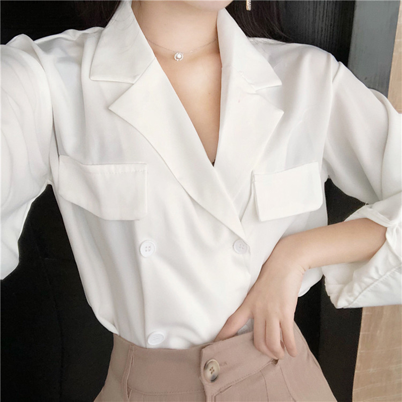 秋裝2018新款韓版氣質西裝領長袖白襯衫寬松顯瘦薄款女生時尚上衣