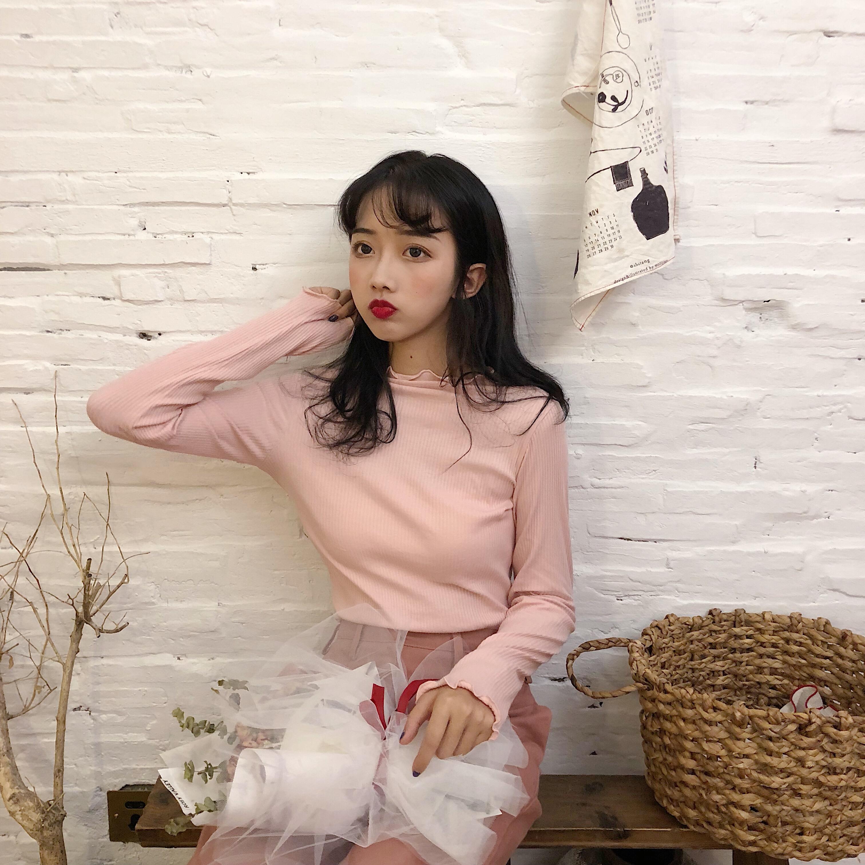 / 秋季女裝韓版糖果色坑條修身顯瘦長袖T恤學生純色卷邊打底衫上衣