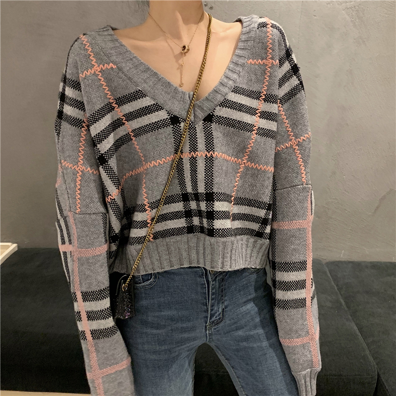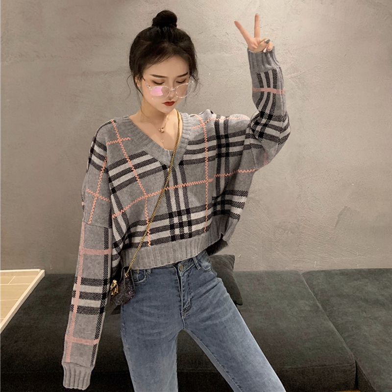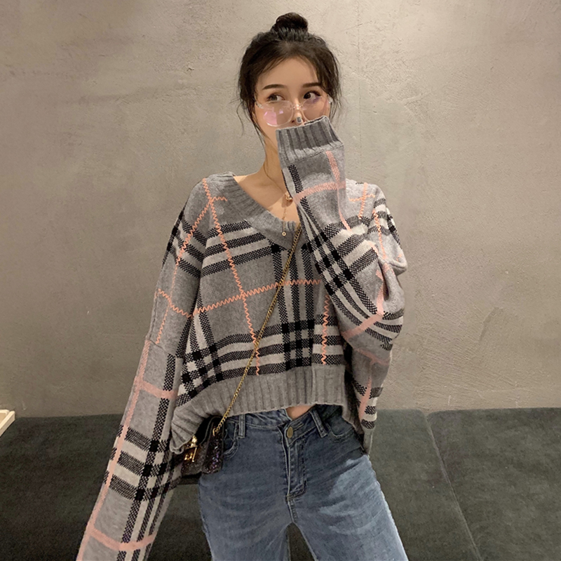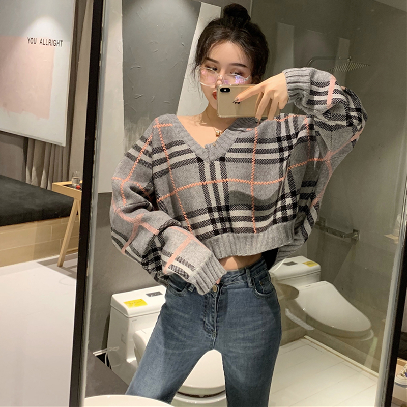 慵懶風格子毛衣外套女秋冬裝2018新款韓版寬松V領長袖短款針織衫