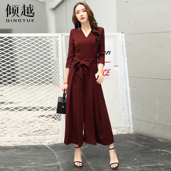傾越連體褲夏季女2017新款韓版高腰V領七分袖腰部系帶闊腿褲套裝