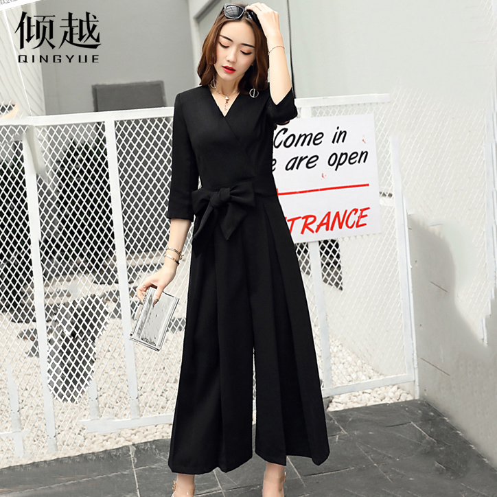 / 傾越連體褲夏季女2017新款韓版高腰V領七分袖腰部系帶闊腿褲套裝