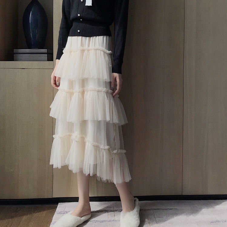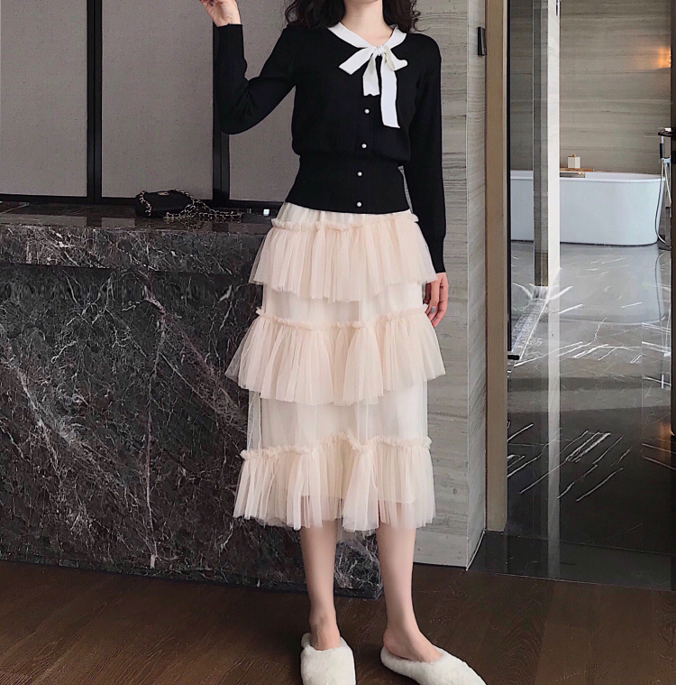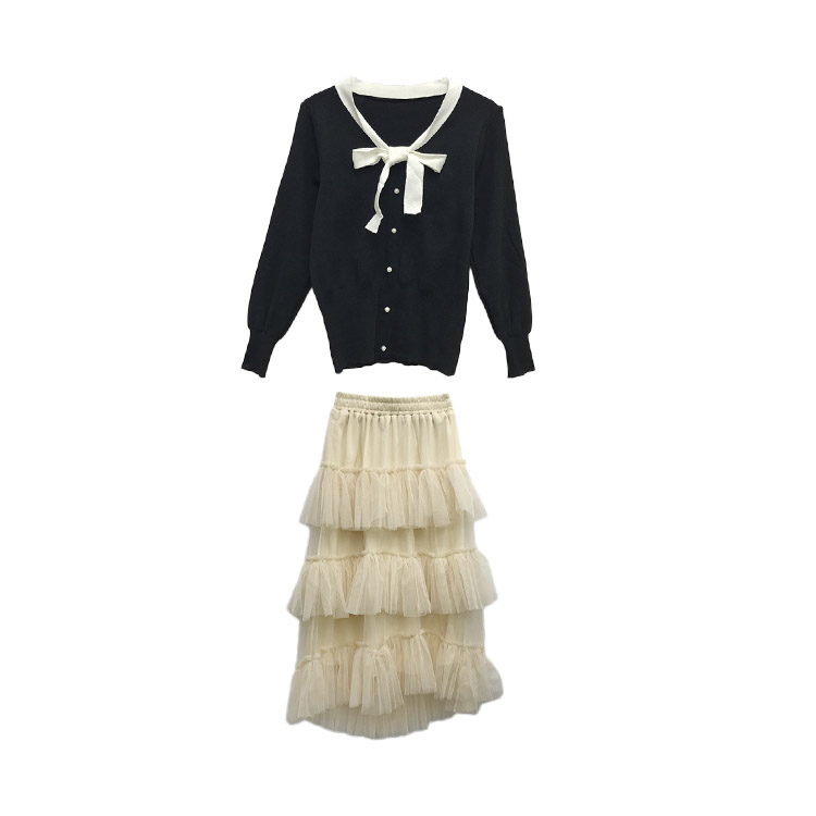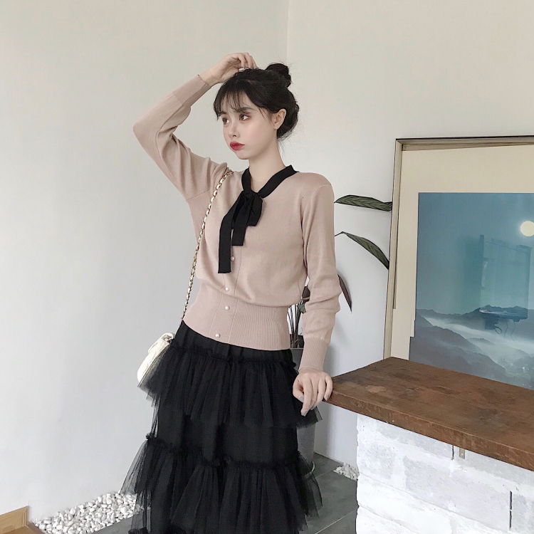 / 小香風領口撞色蝴蝶結長袖針織衫+新款網紗拼接半身裙層層蛋糕裙