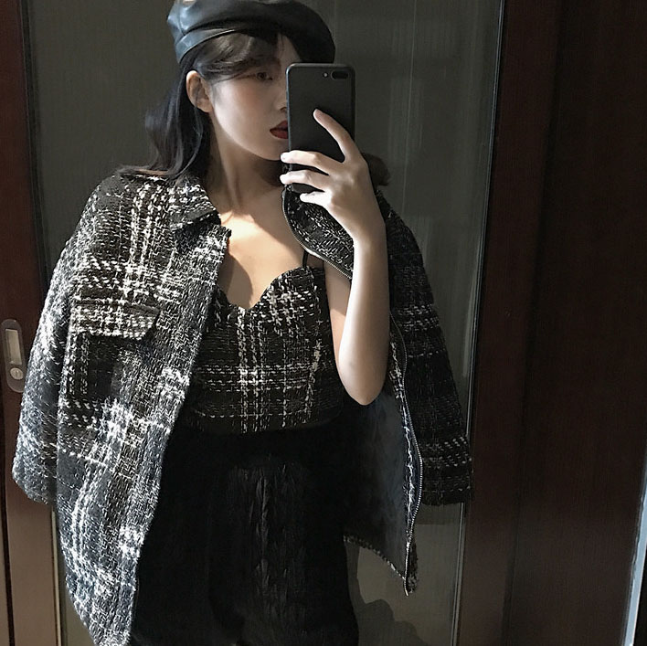 時尚小香風套裝女秋冬2018新款修身打底背心+長袖百搭粗花呢外套