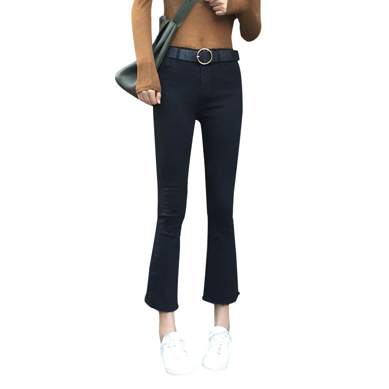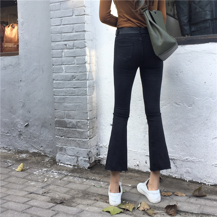 秋季女裝韓版復古黑色微喇叭褲牛仔褲高腰顯瘦毛邊九分褲學生褲子