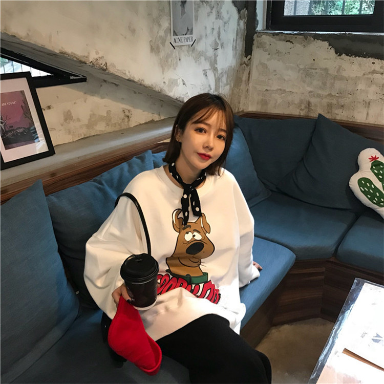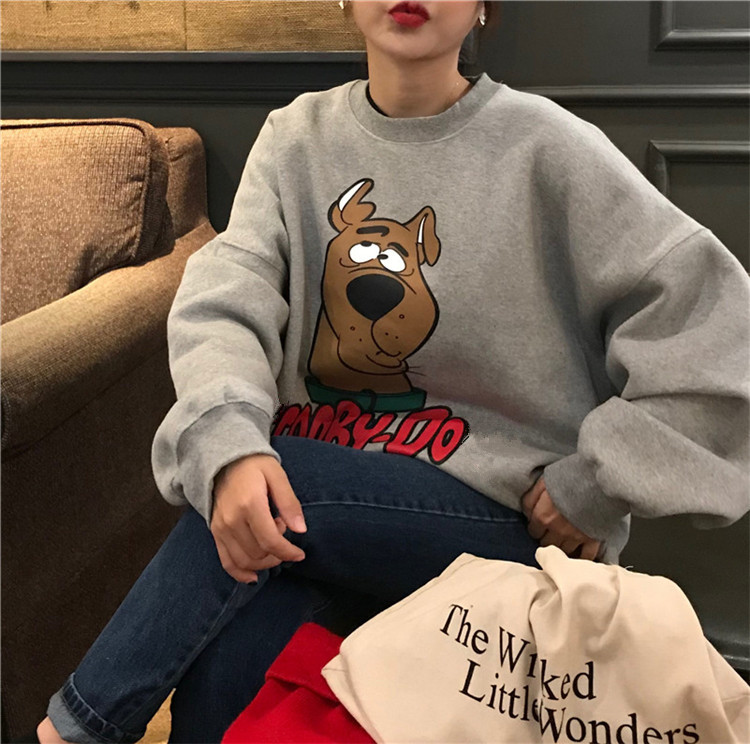 / 秋冬女裝韓版中長款原宿風小狗字母卡通寬松加絨加厚衛衣上衣外套