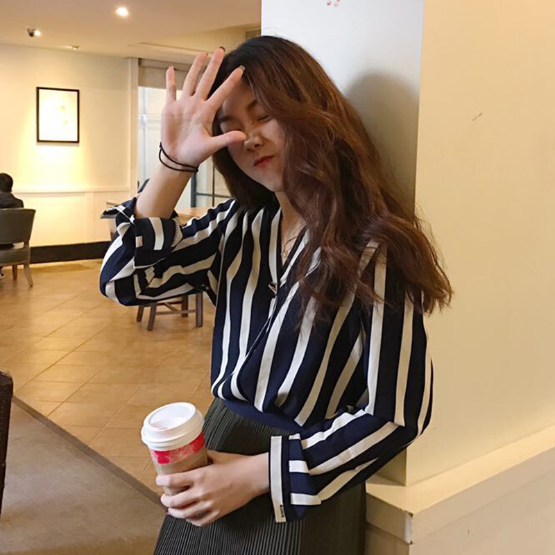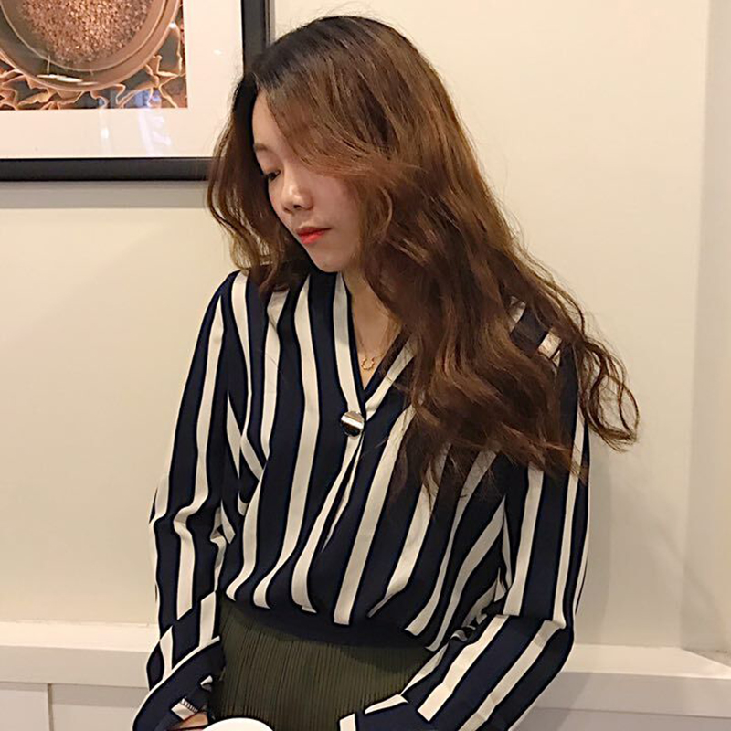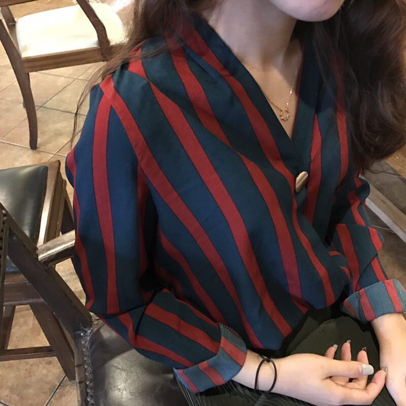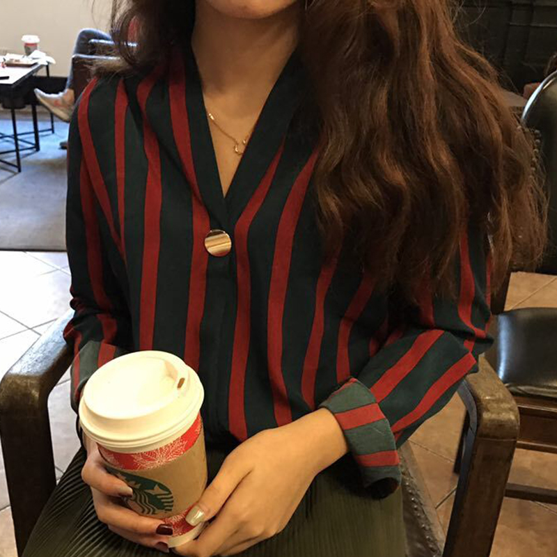 / 港味復古上衣秋裝女2018新款寬松顯瘦時尚一粒扣V領長袖條紋襯衫