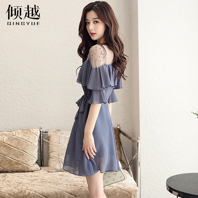 / 2017夏季新款甜美圓領短袖a字裙顯瘦修身氣質網紗拼接純色連衣裙