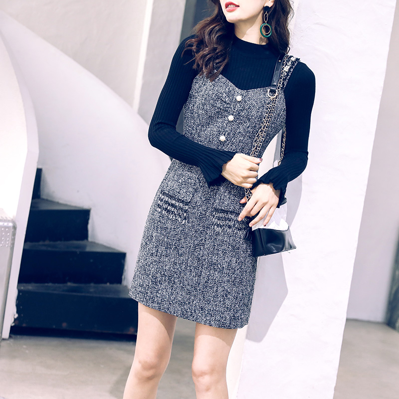 針織上衣毛呢連衣裙女秋冬季新款2018背帶裙兩件套小個子短款裙子