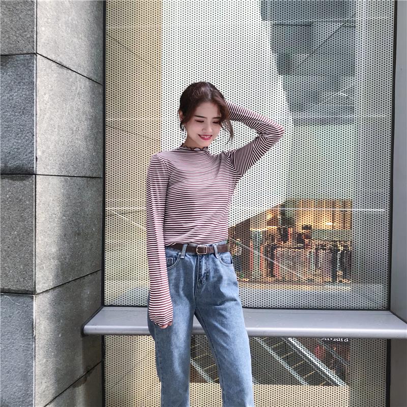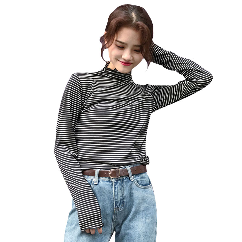 / 秋裝女裝韓版撞色條紋修身顯瘦波紋半高領長袖打底衫T恤上衣學生