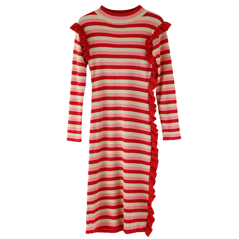 / 歐洲站2018新款秋季韓版女裝極簡慵懶復古港味初戀條紋開叉連衣裙